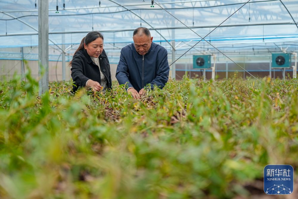 ↑ 11月7日,双泉庄村党支部书记王庆柱(右)在查看石斛生长情况。
