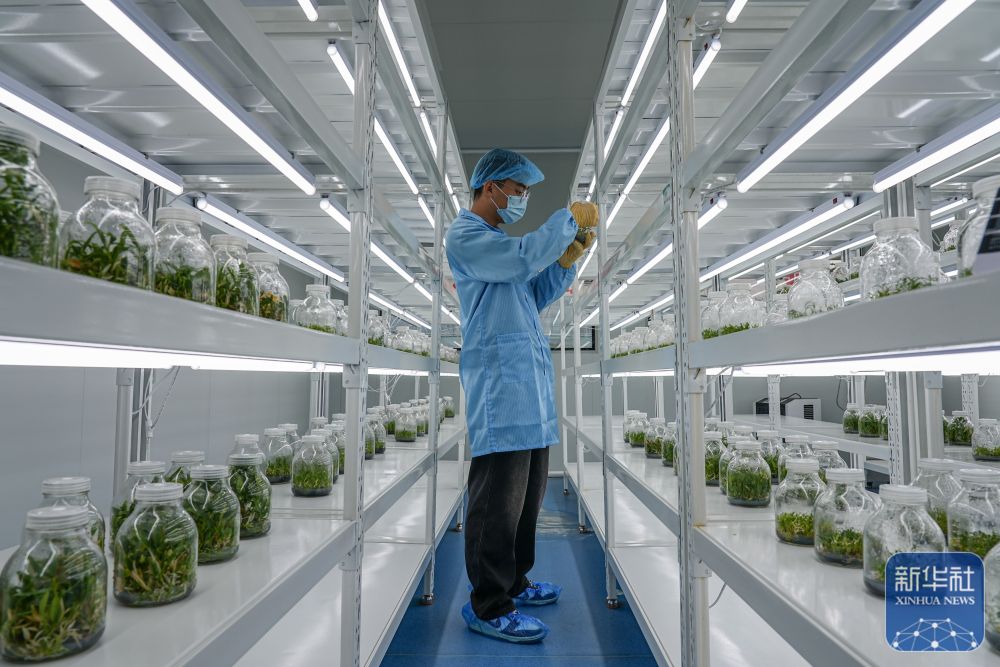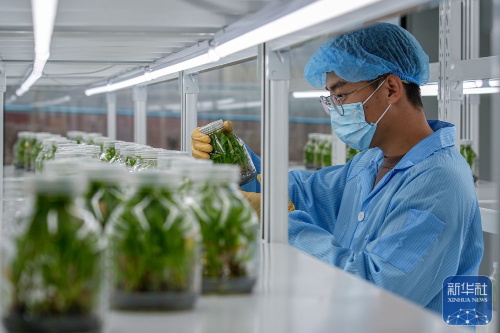 ↑ 11月7日,农技人员在双泉庄村中草药脱毒组培苗繁育实验室内观察石斛秧苗。