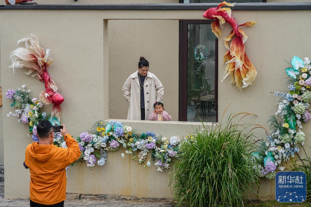 ↑ 11月7日,游人在双泉庄村民宿片区打卡拍照。