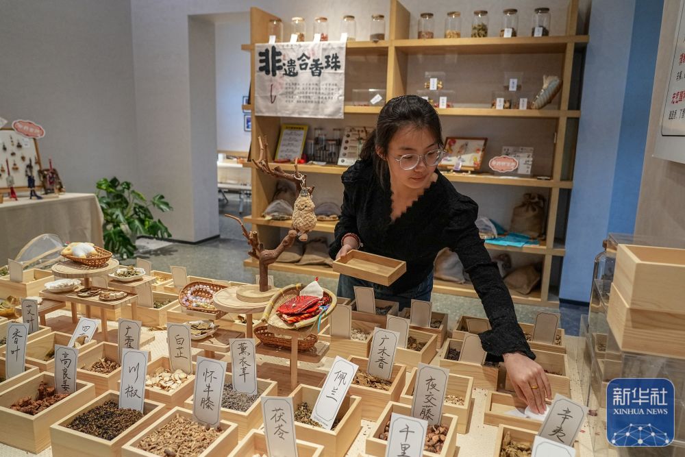 ↑ 11月7日,游人在双泉庄村民宿片区制作传统香囊,体验中医文化。