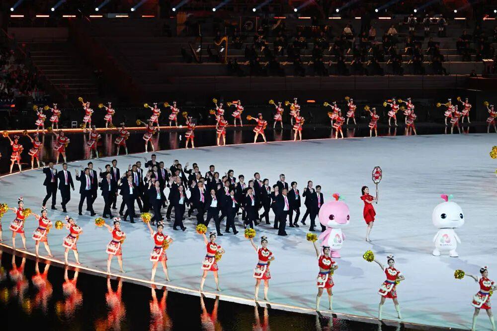 广东省体育代表团、香港特别行政区体育代表团、澳门特别行政区体育代表团在入场仪式上共同入场。新华社记者黄伟摄