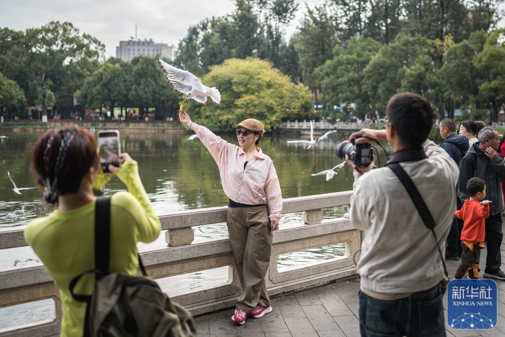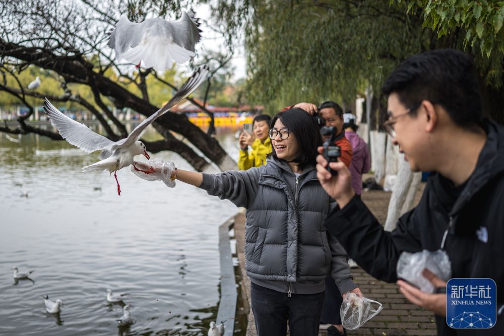 ↑ 11月8日,游客在云南省昆明市翠湖公园内喂红嘴鸥。
