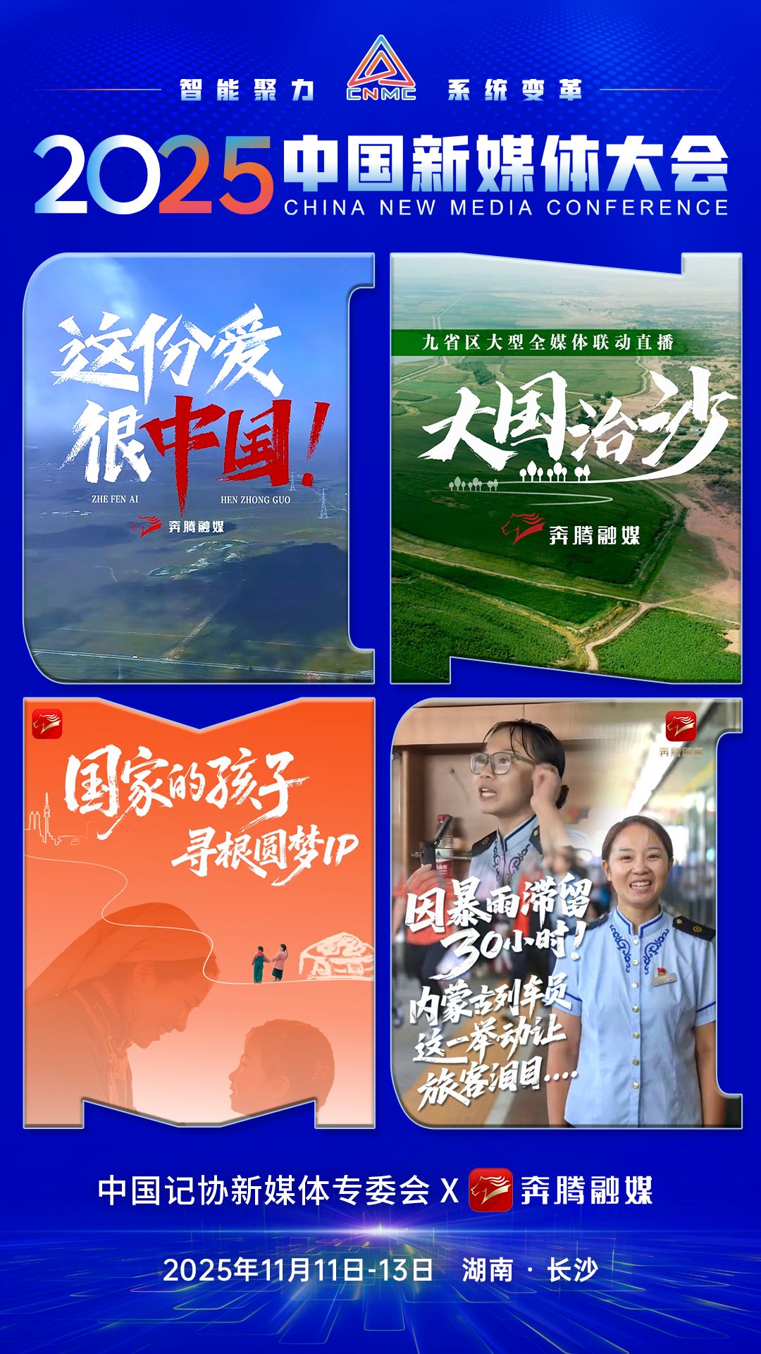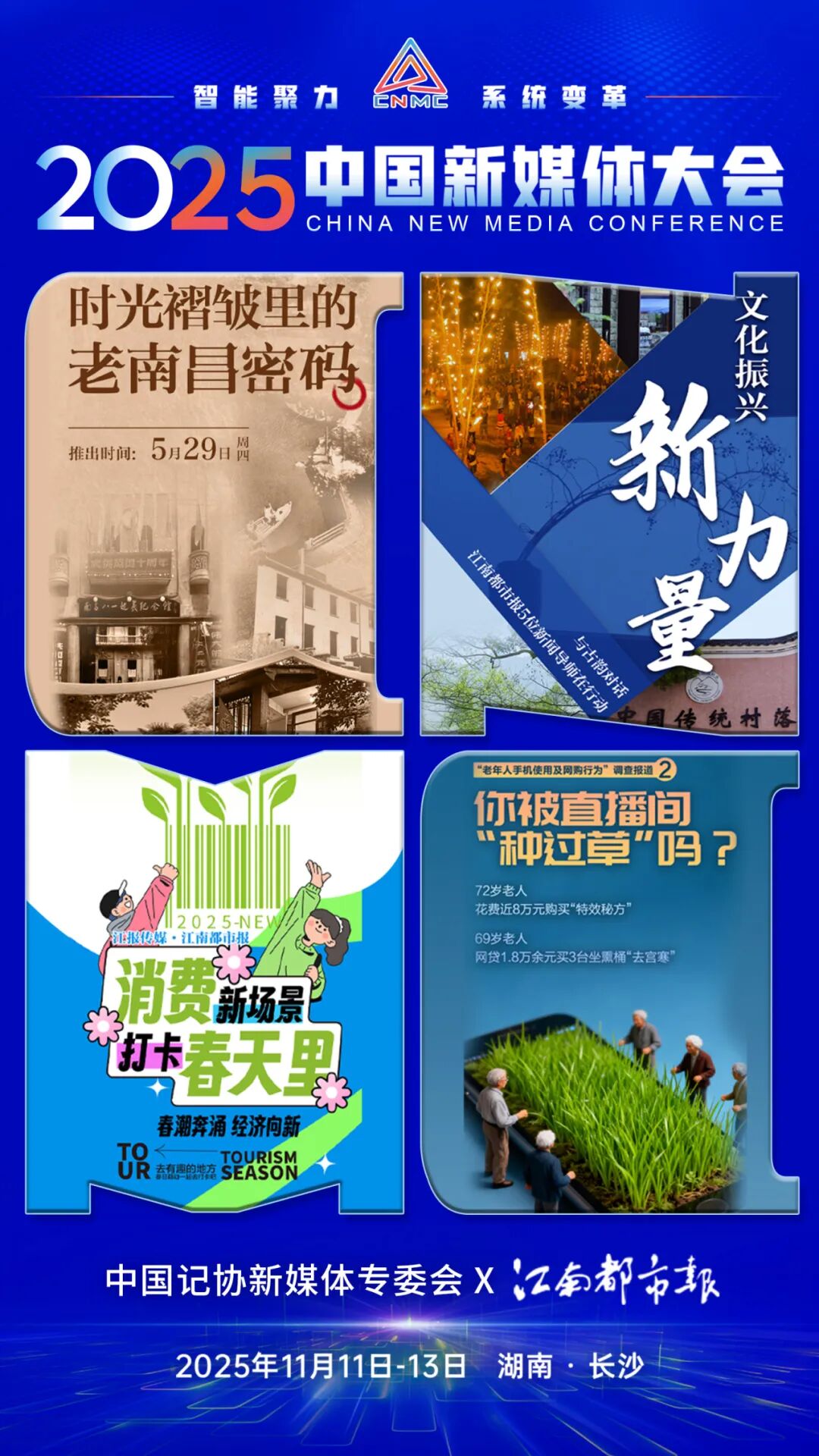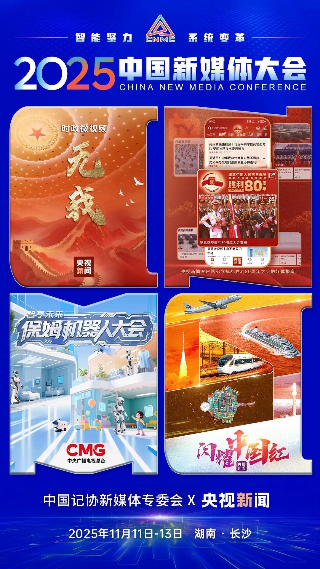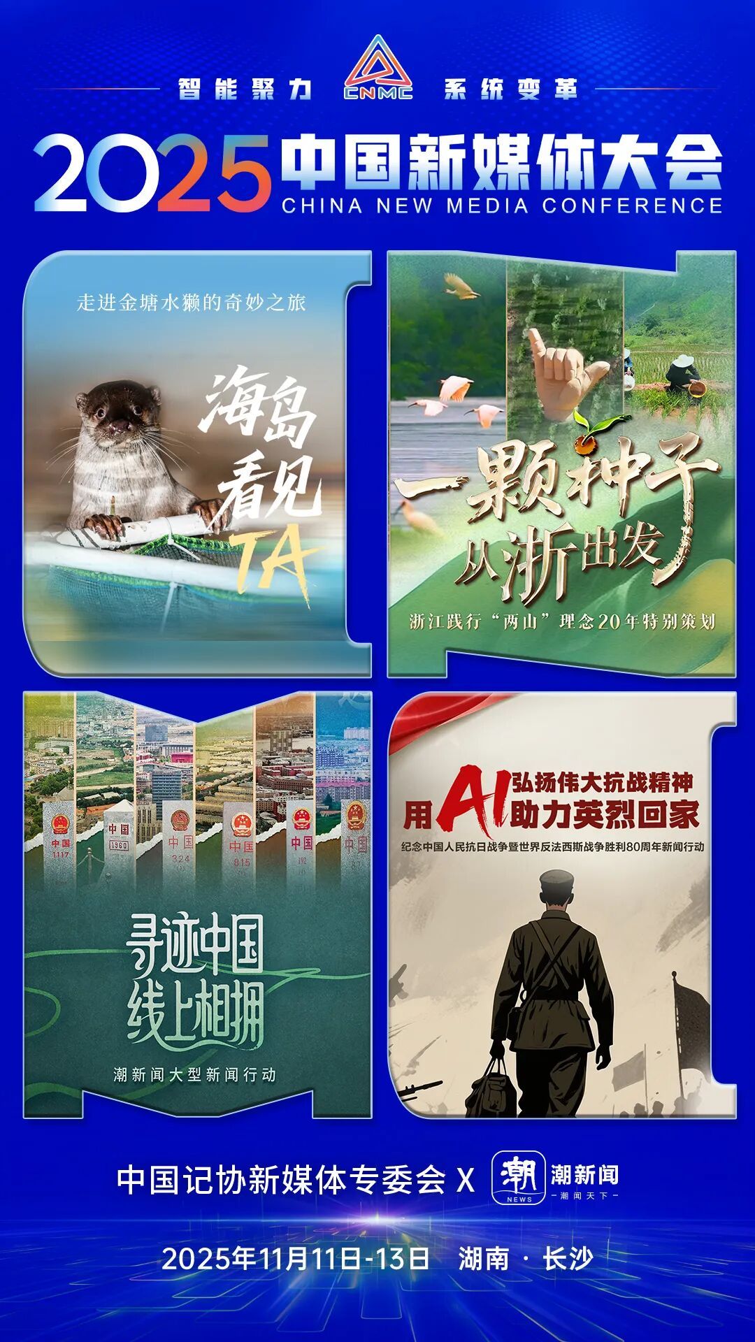 2025中国新媒体大会于11日至13日在湖南长沙召开,中国记协新媒体专业委员会各成员单位纷纷推出“联名海报”为大会预热。