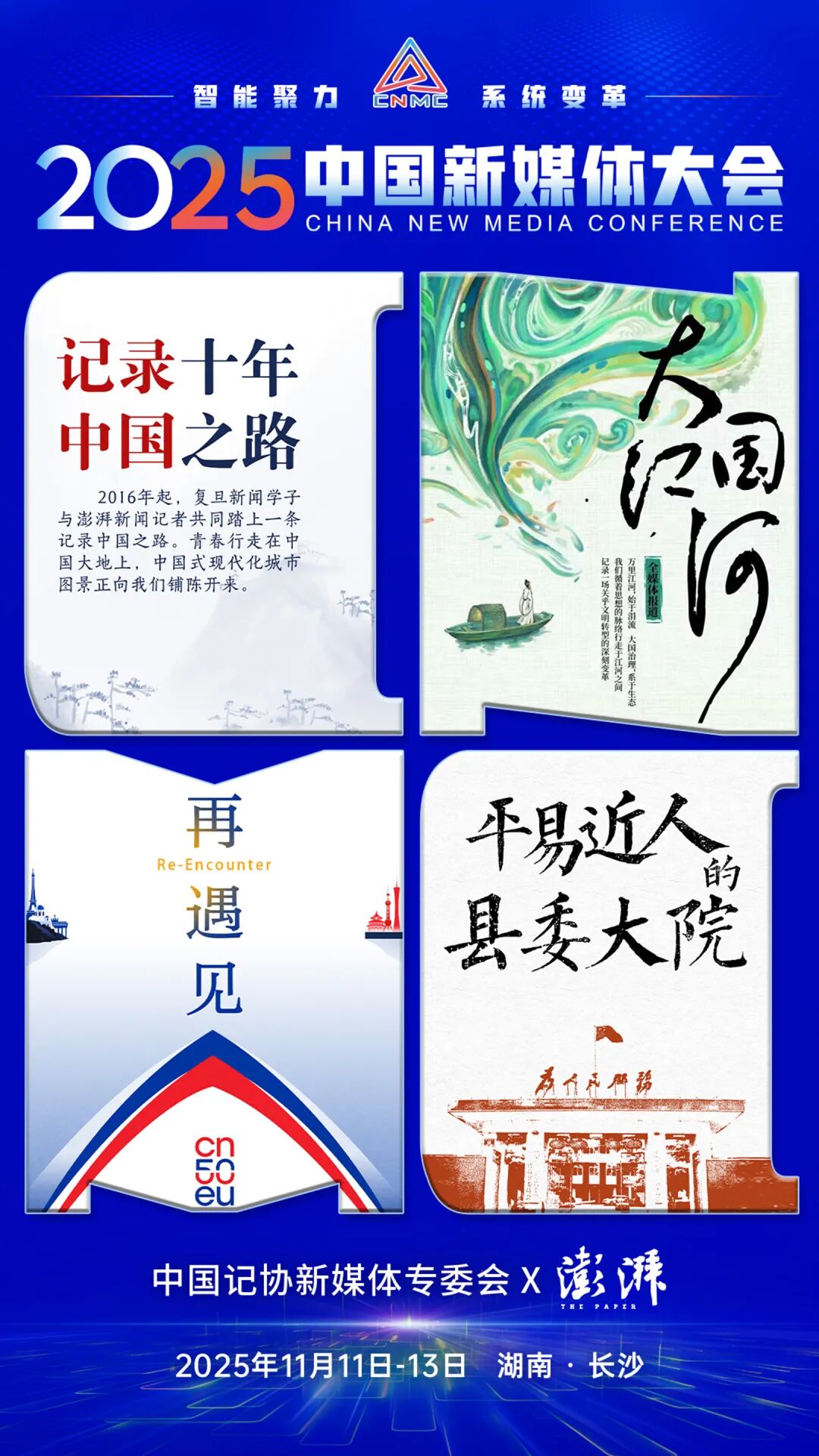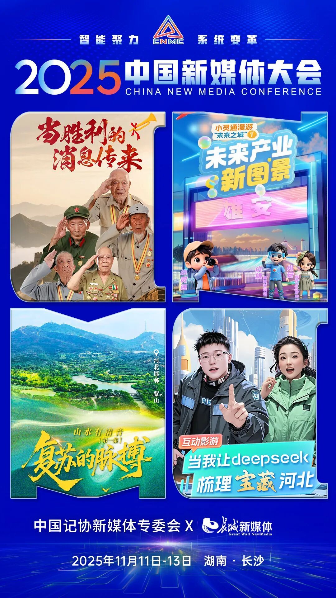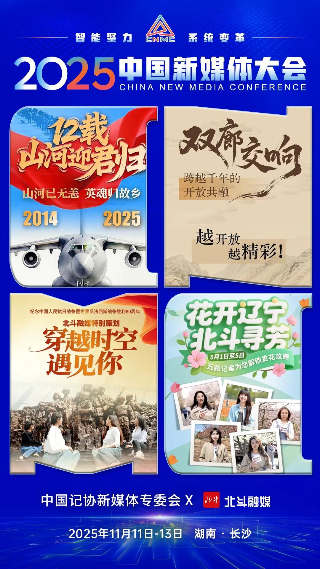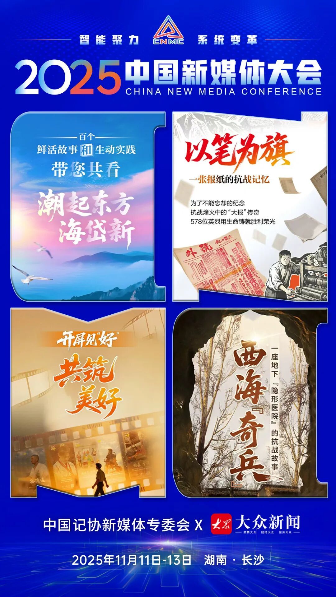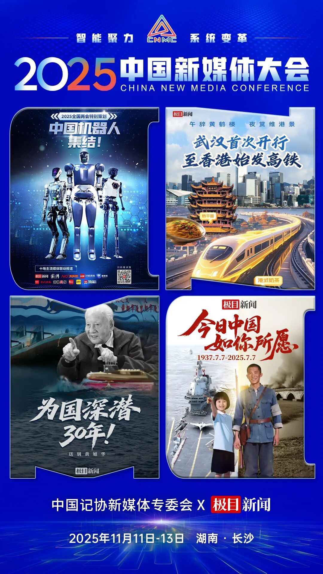 2025中国新媒体大会于11日至13日在湖南长沙召开,中国记协新媒体专业委员会各成员单位纷纷推出“联名海报”为大会预热。