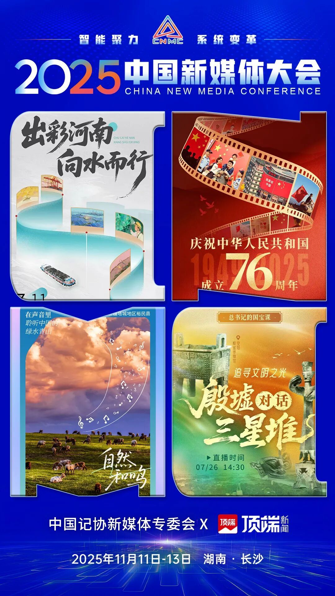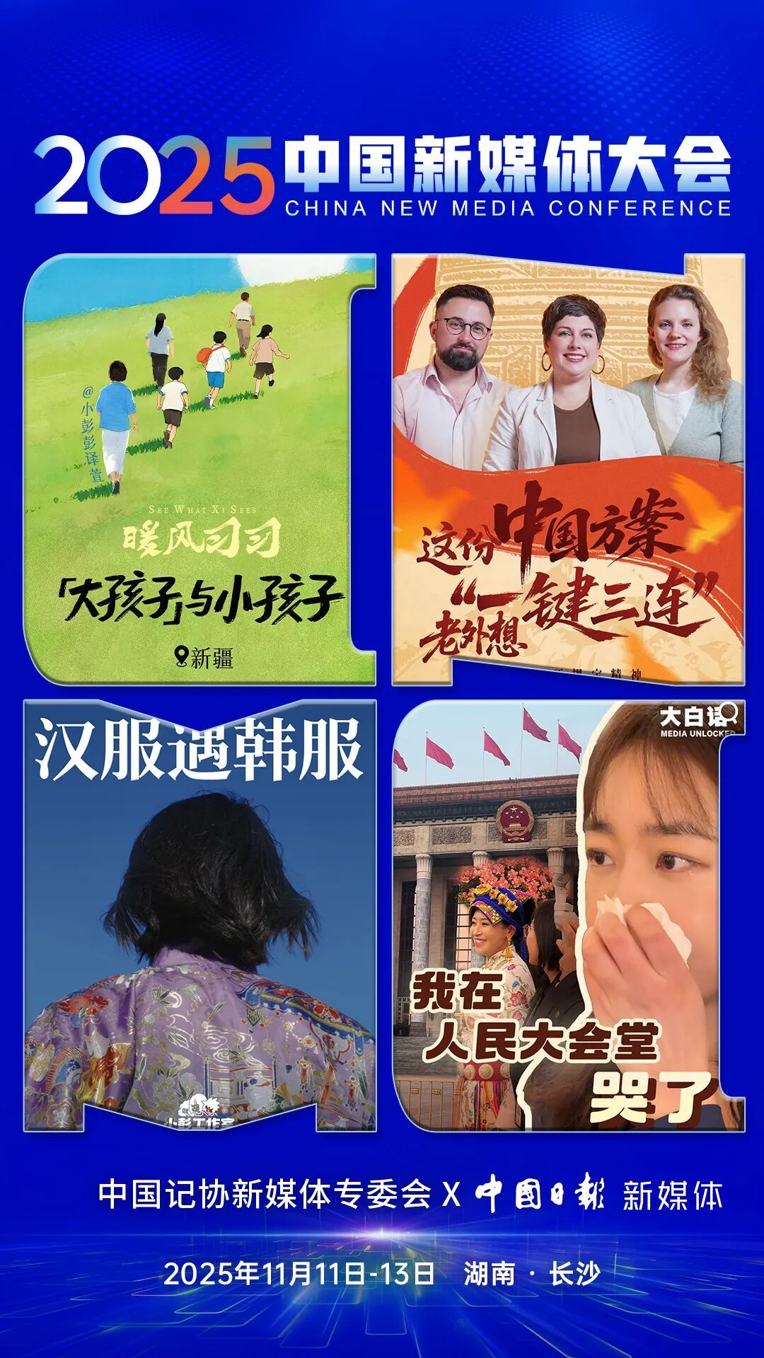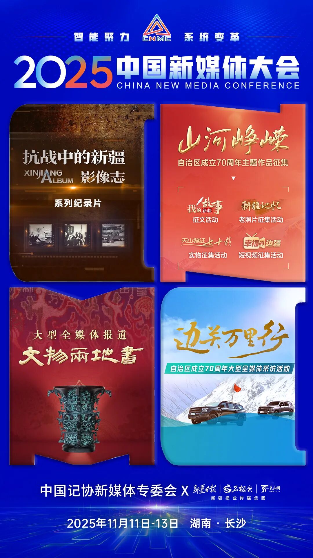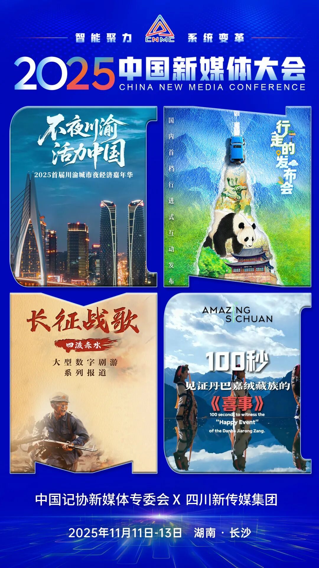 2025中国新媒体大会于11日至13日在湖南长沙召开,中国记协新媒体专业委员会各成员单位纷纷推出“联名海报”为大会预热。