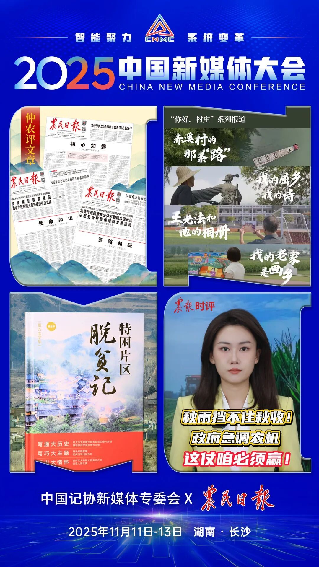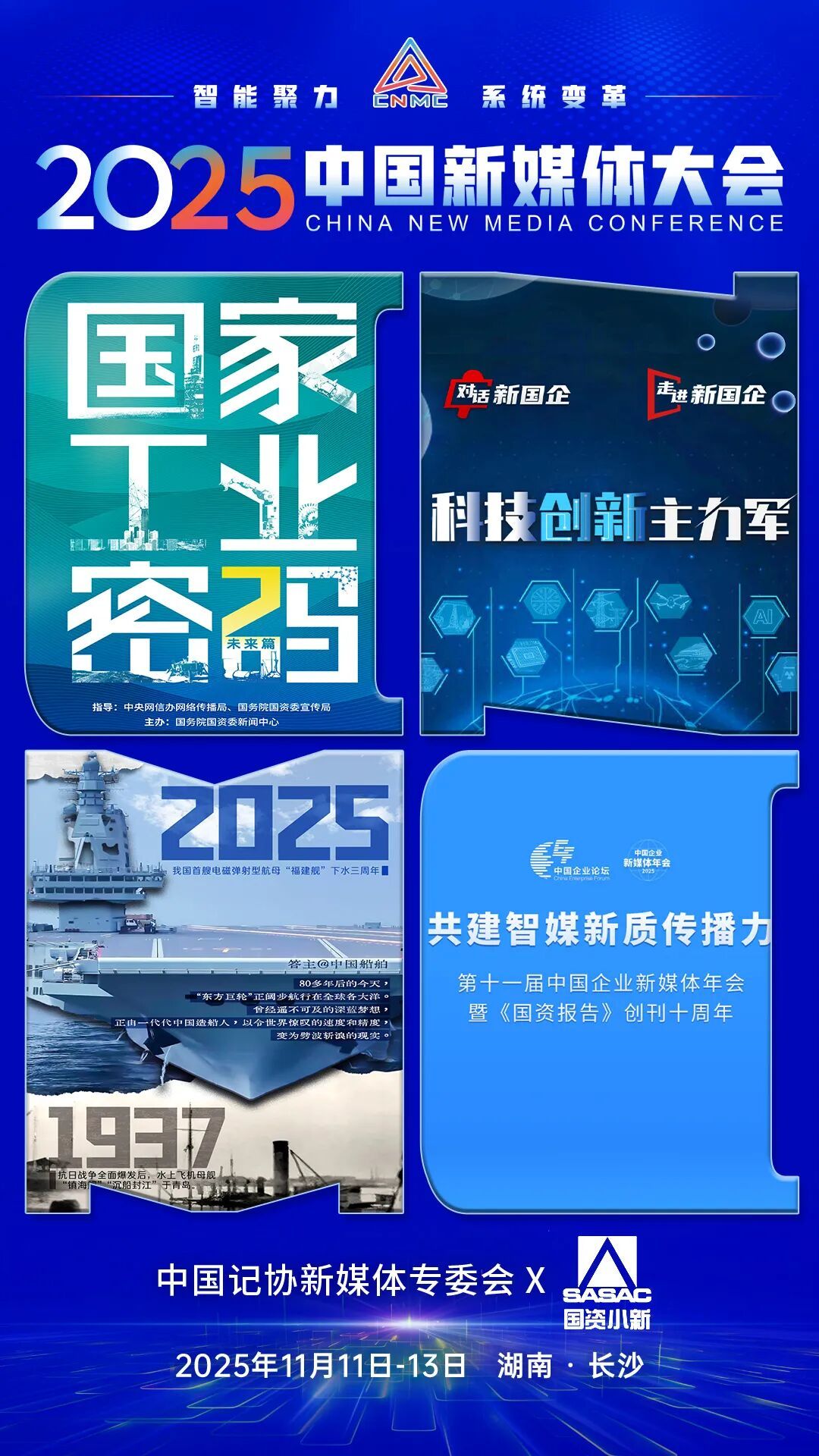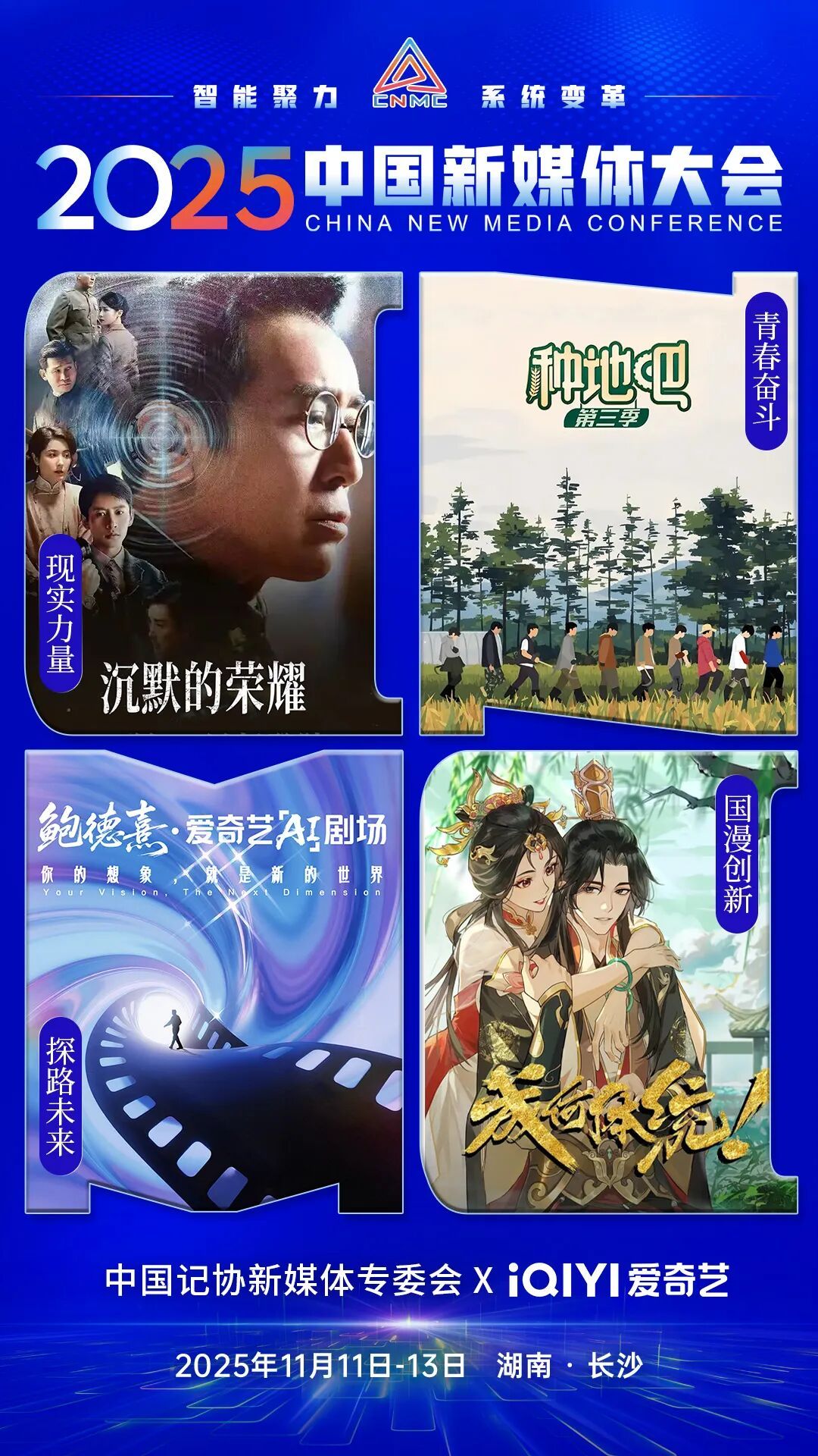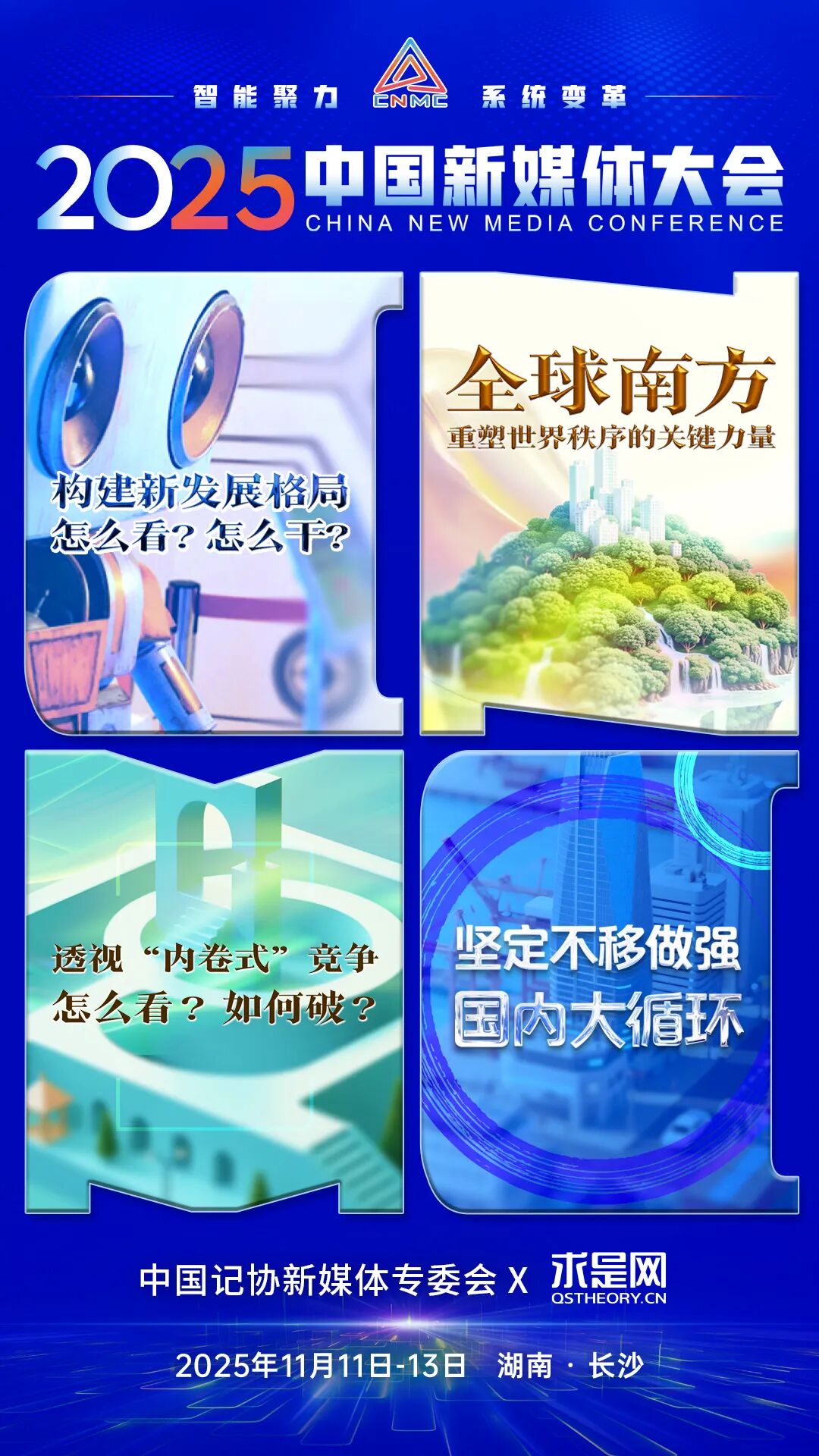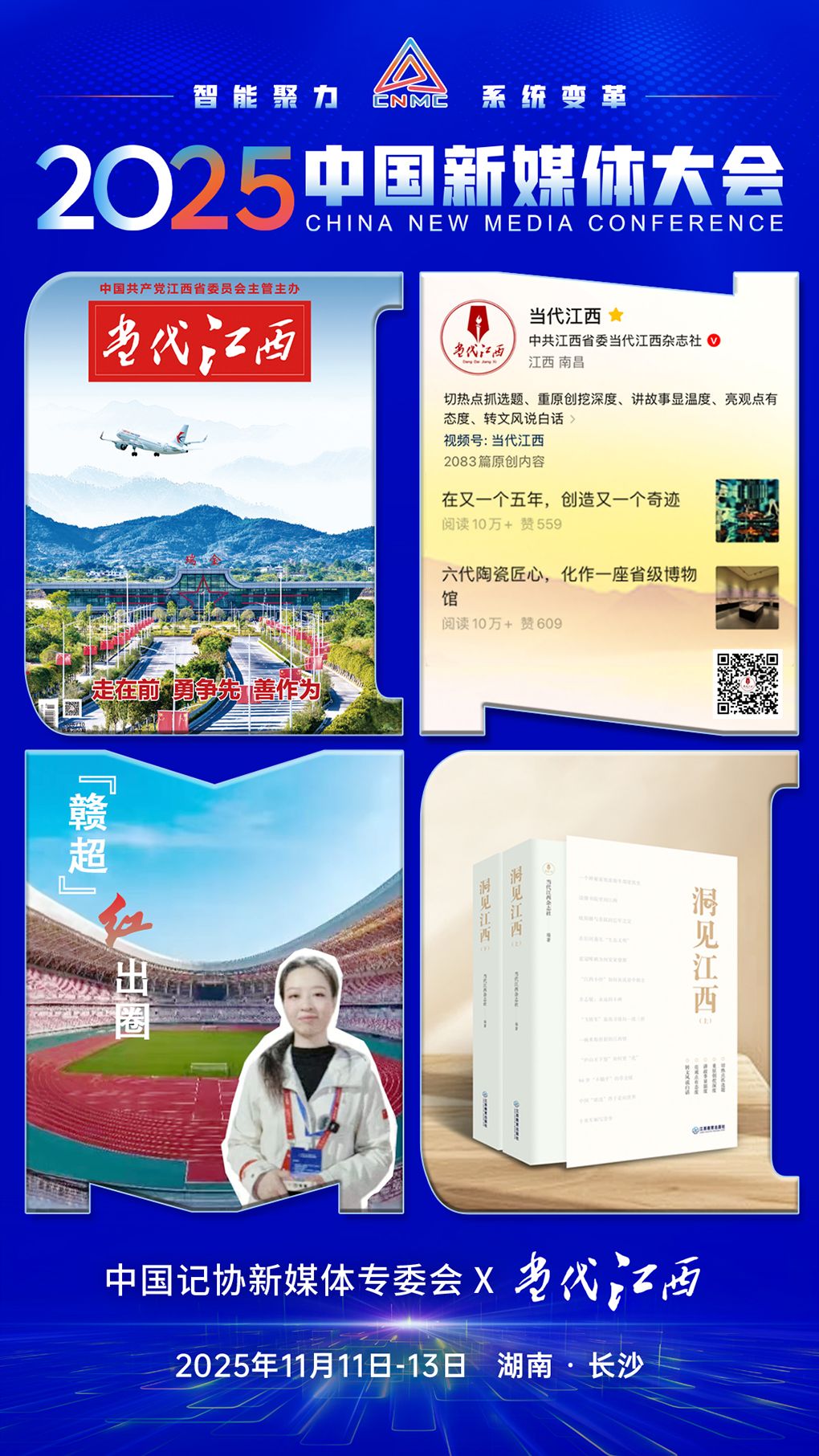 2025中国新媒体大会于11日至13日在湖南长沙召开,中国记协新媒体专业委员会各成员单位纷纷推出“联名海报”为大会预热。