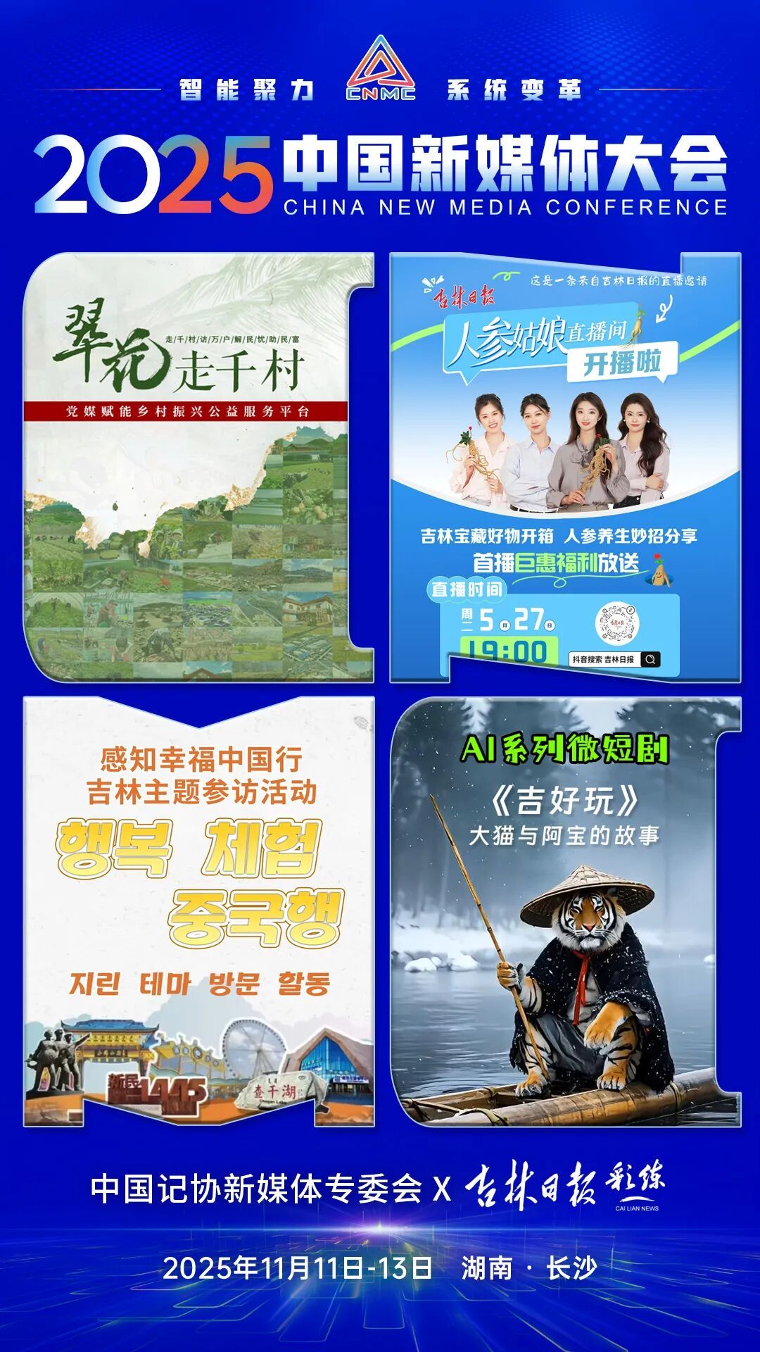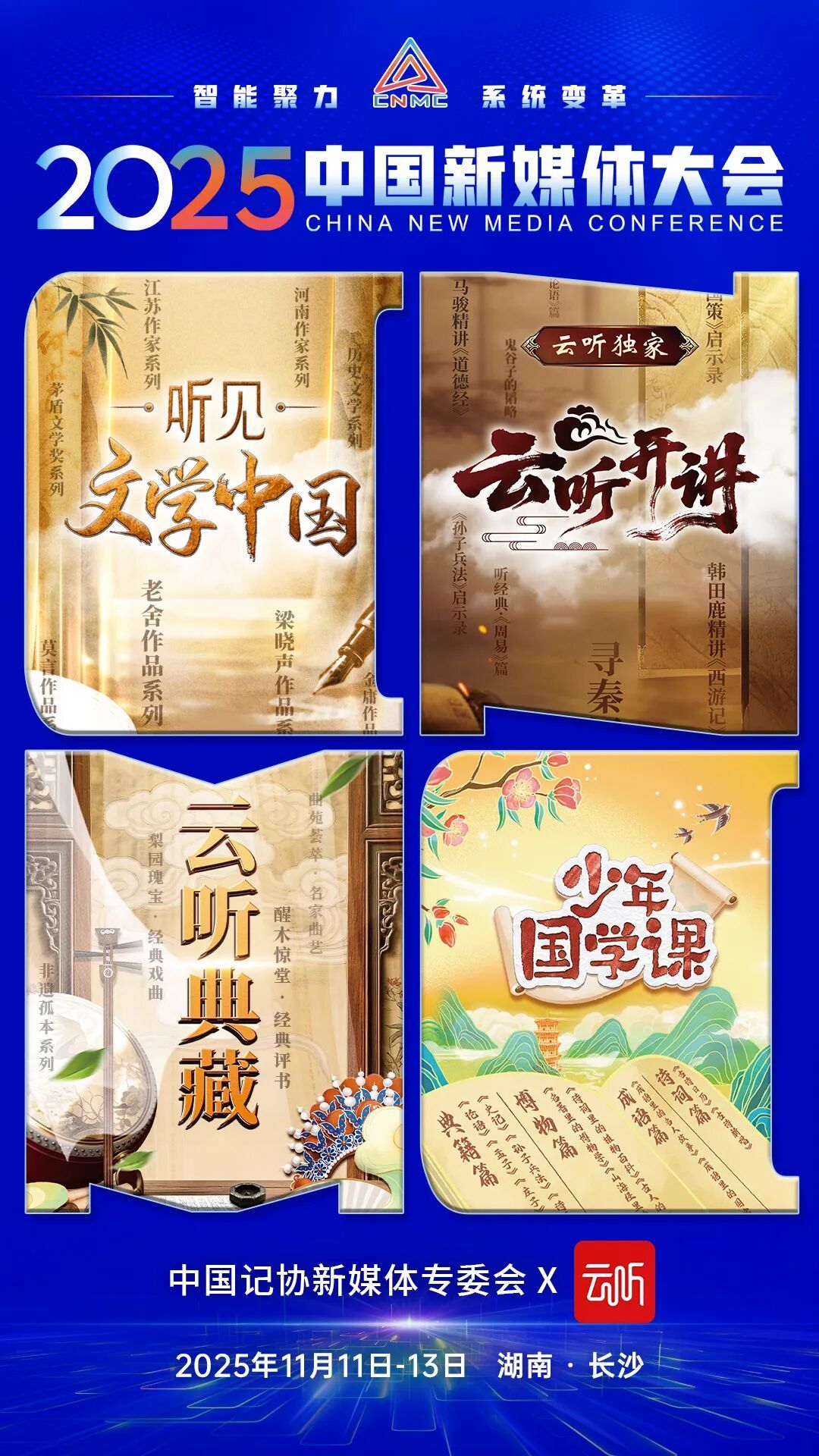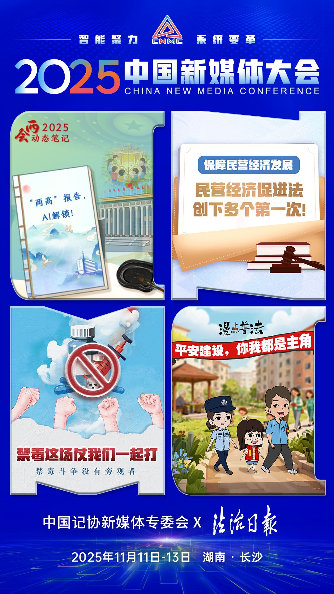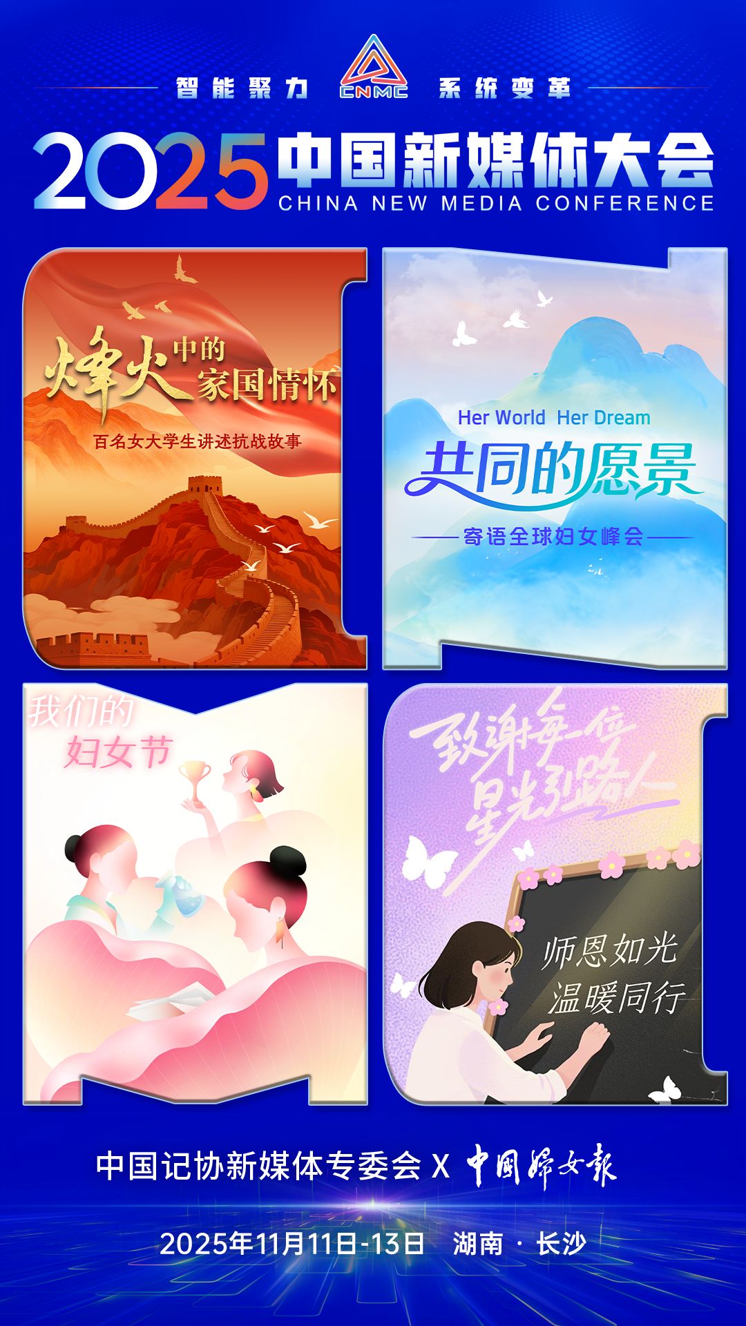 2025中国新媒体大会于11日至13日在湖南长沙召开,中国记协新媒体专业委员会各成员单位纷纷推出“联名海报”为大会预热。