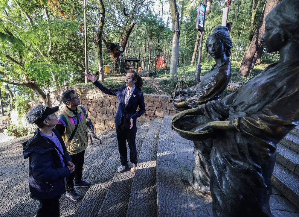 ↑11月20日,在诸暨西施故里景区,参加今年金牌导游选拔的年轻导游(左)在给游客们讲述西施的故事。