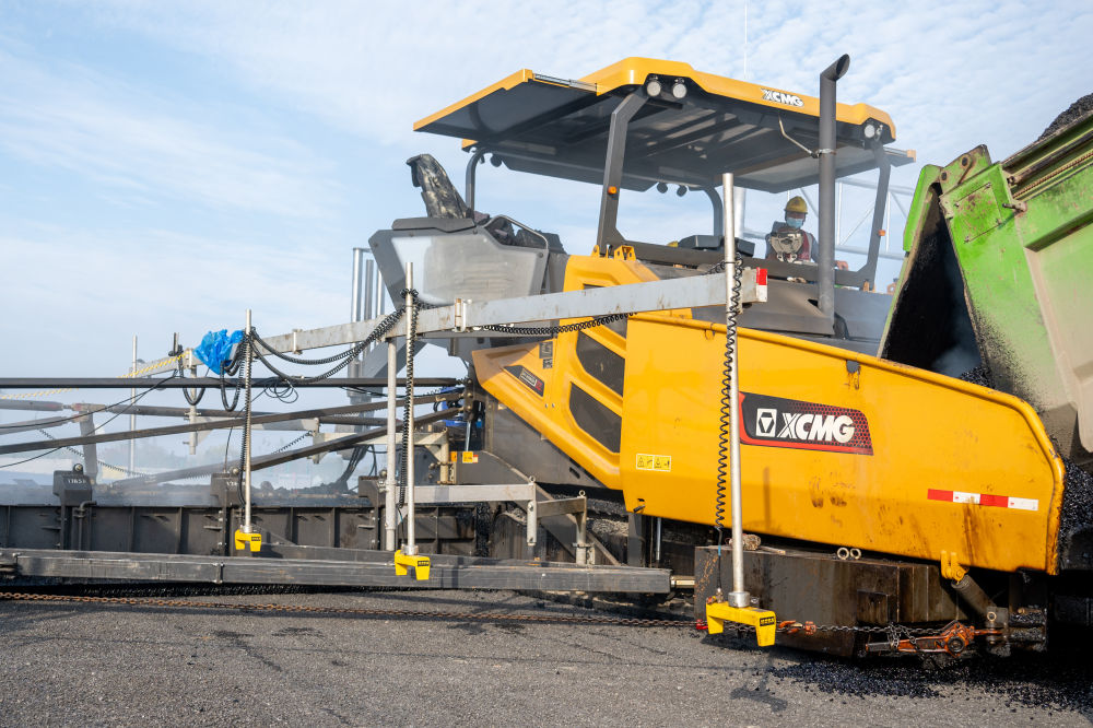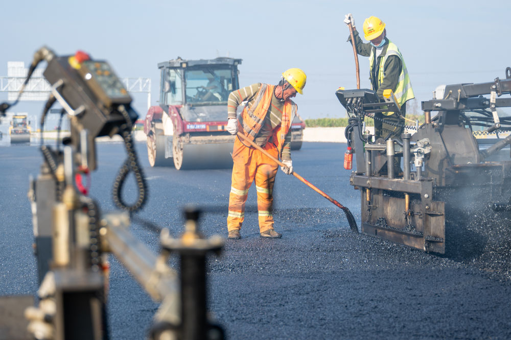 ↑11月20日,中铁十一局工人在京港澳高速湖北北段改扩建孝南互通枢纽铺沥青。