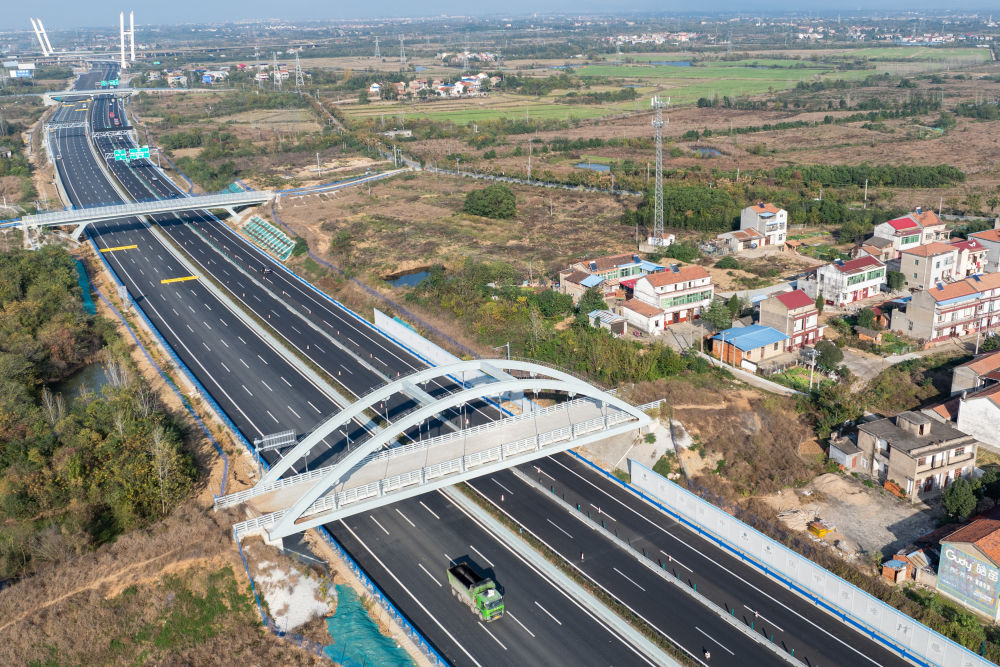 ↑这是11月20日拍摄的京港澳高速湖北北段改扩建三草线跨线天桥(无人机照片)。