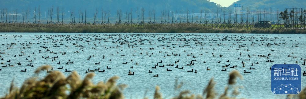 ↑ 11月20日,在浙江省温岭市东海塘,越冬候鸟在水面游弋。新华社发(周学军 摄)