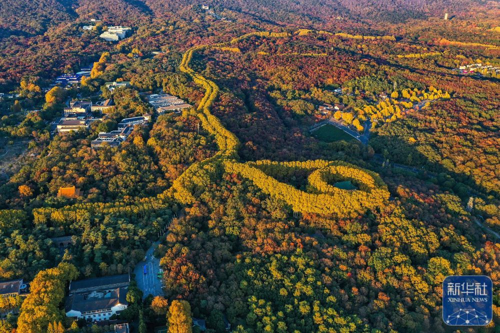 ↑ 11月19日拍摄的南京钟山风景名胜区景色(无人机照片)。新华社发(辛一 摄)