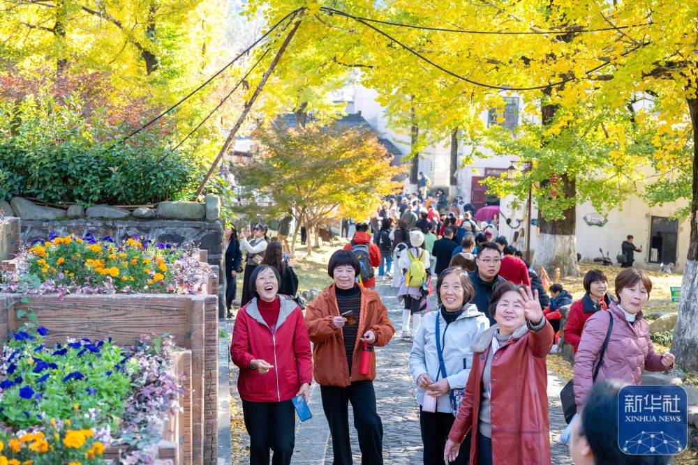 ↑ 11月20日,游客在浙江省湖州市长兴县小浦镇八都岕“十里古银杏长廊”景区游览。新华社发(谭云俸 摄)