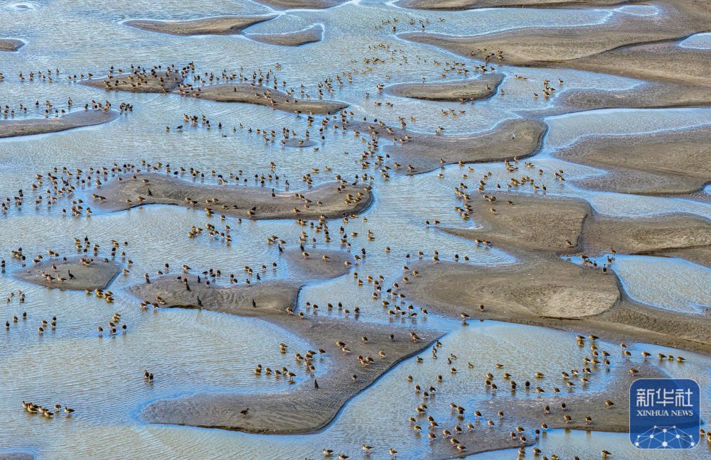 ↑ 11月20日,在长江湖北黄石段,候鸟在江面上觅食(无人机照片)。新华社发(周巍 摄)