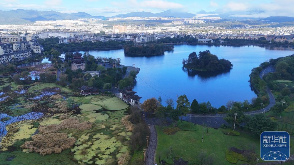 ↑ 11月20日拍摄的云南腾冲欢乐湖畔景色(无人机照片)。新华社发(赵辉 摄)
