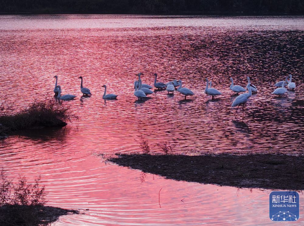 ↑ 11月19日,福建武夷山国家公园一号风景道旁,一群天鹅在水面栖息(无人机照片)。新华社发(黄杰敏 摄)