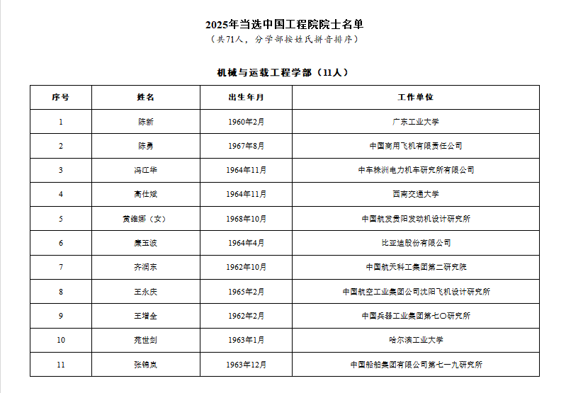 关于公布中国工程院2025年院士增选当选院士名单的公告