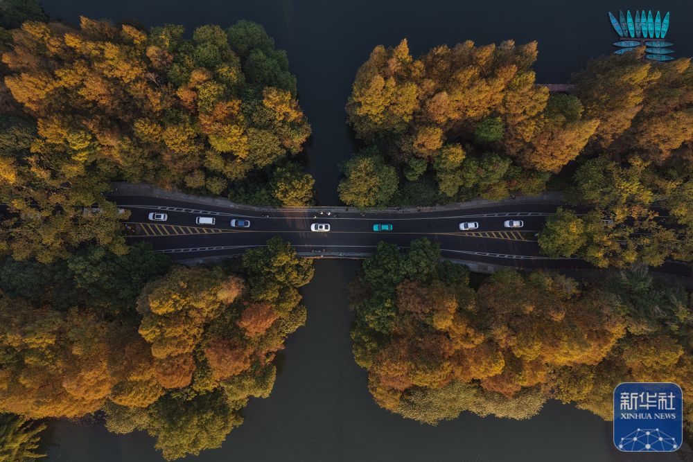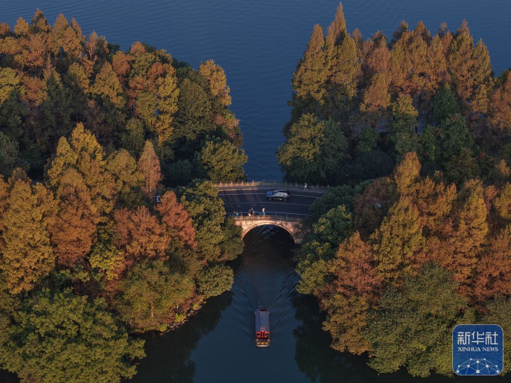 ↑ 11月21日,汽车行驶在杭州西湖景区的杨公堤上,游客乘船从桥下穿过(无人机照片)。新华社记者 黄宗治 摄