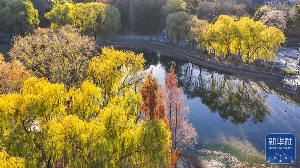 ↑ 11月21日,游人在河北省遵化市人民公园游览(无人机照片)。新华社发(刘满仓 摄)