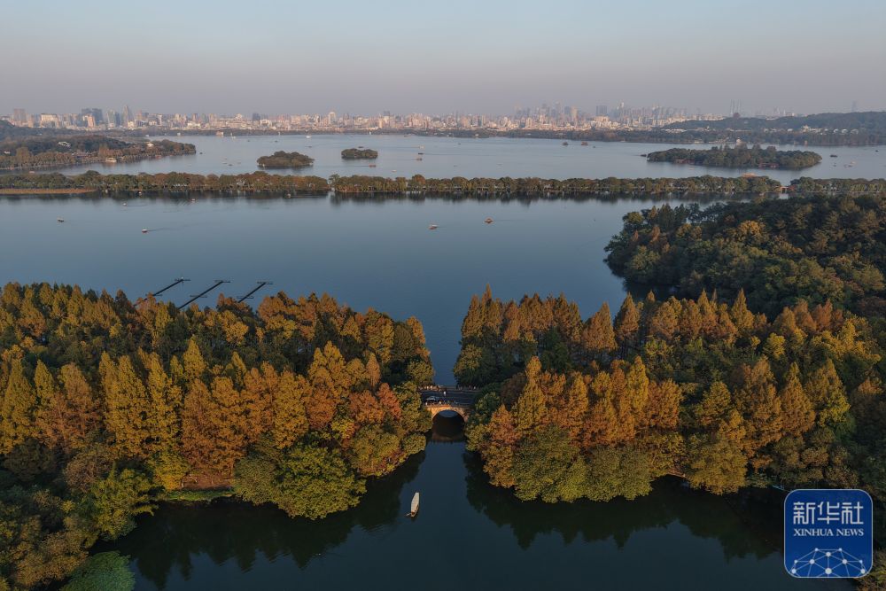 ↑ 11月21日拍摄的杭州西湖景区杨公堤附近的景色(无人机照片)。新华社记者 黄宗治 摄