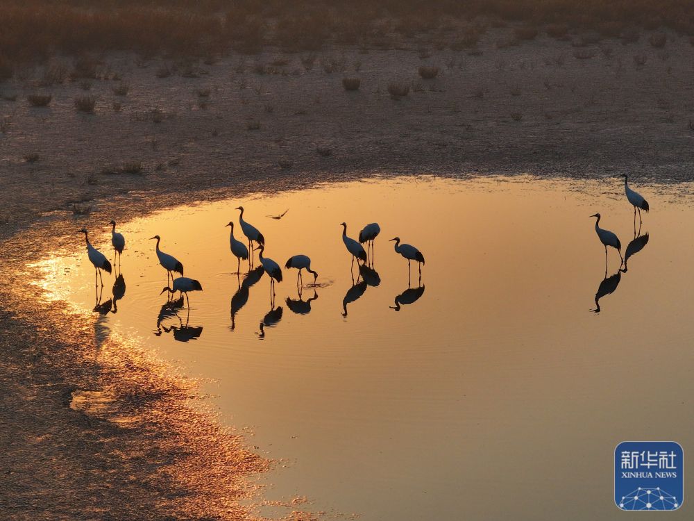 ↑ 11月21日,鹤群在江苏省连云港市海州湾沿海湿地栖息(无人机照片)。新华社发(司伟 摄)