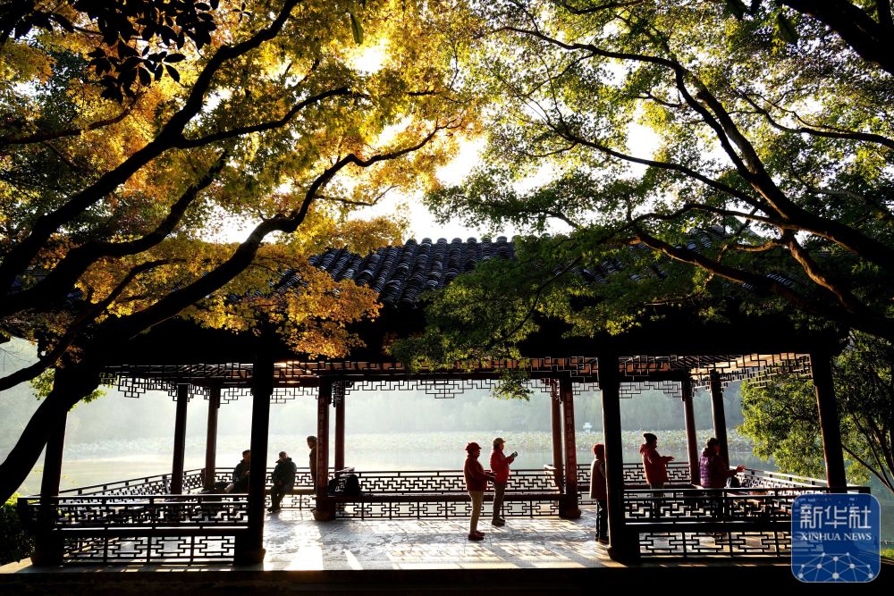 ↑ 11月21日,人们在杭州西湖绿水芙蕖亭中晨练。新华社发(庄颖昶 摄)