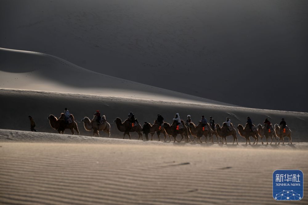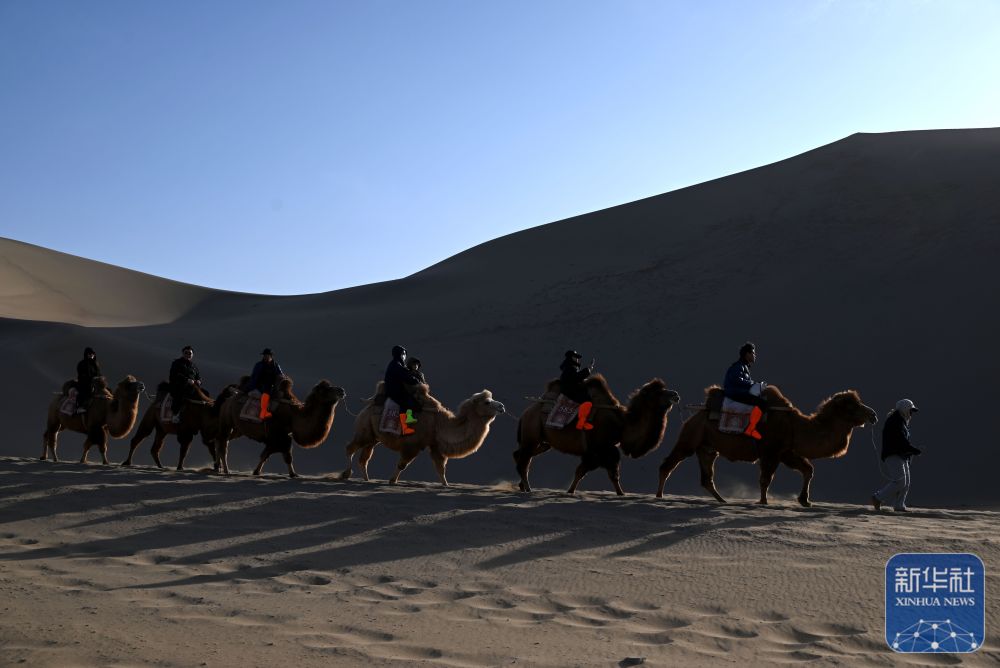 冬日时节,甘肃省敦煌市鸣沙山月牙泉景区暖阳高照,驼铃悠扬,景色如画,游客徜徉其中欣赏大漠风光,体验丝路风情。