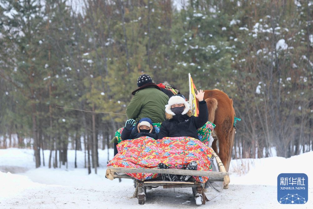 ↑ 11月22日,游客在漠河北极村体验马拉爬犁。