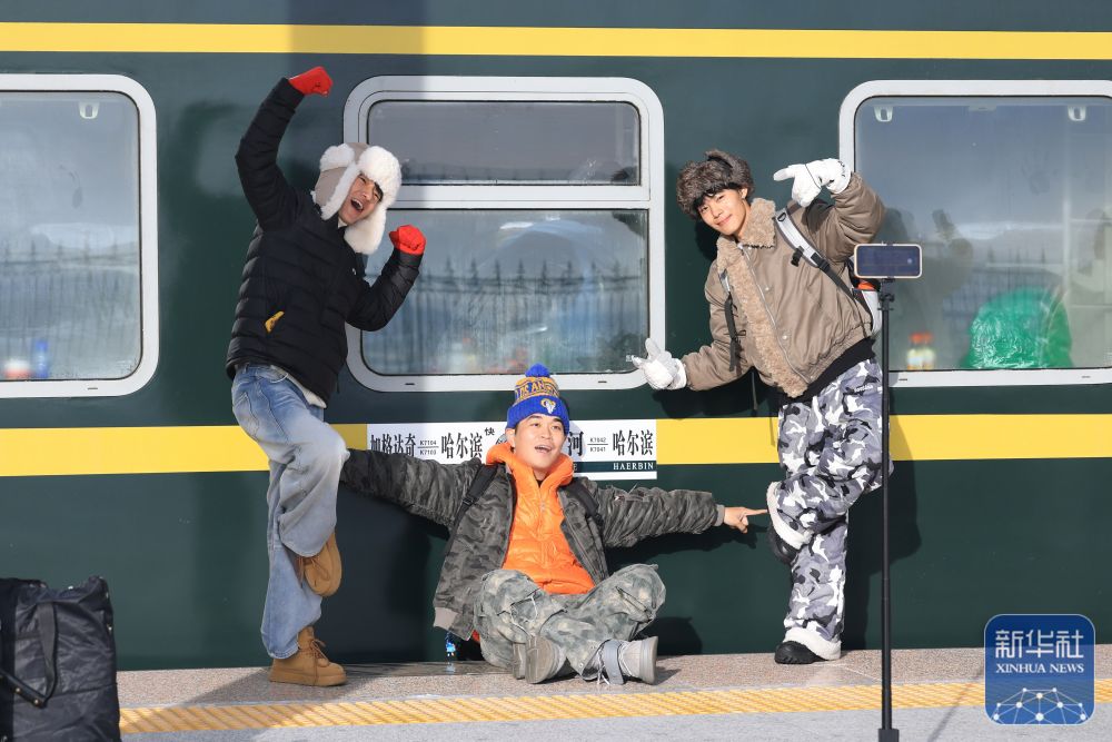 ↑ 11月20日,游客在哈尔滨站准备乘坐K7041次“雪国列车”去漠河“找北”。