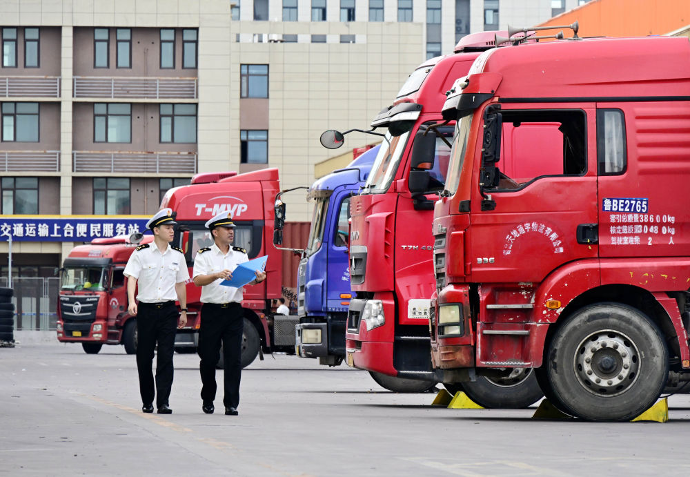 2025年8月27日,海关关员在中国传化(上合)国际物流港内监管货车发运。新华社记者 李紫恒 摄