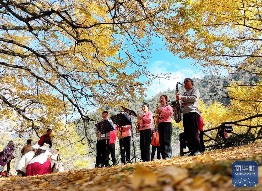 ↑ 11月23日,萨克斯爱好者在桐子坳村银杏树下为游客表演。