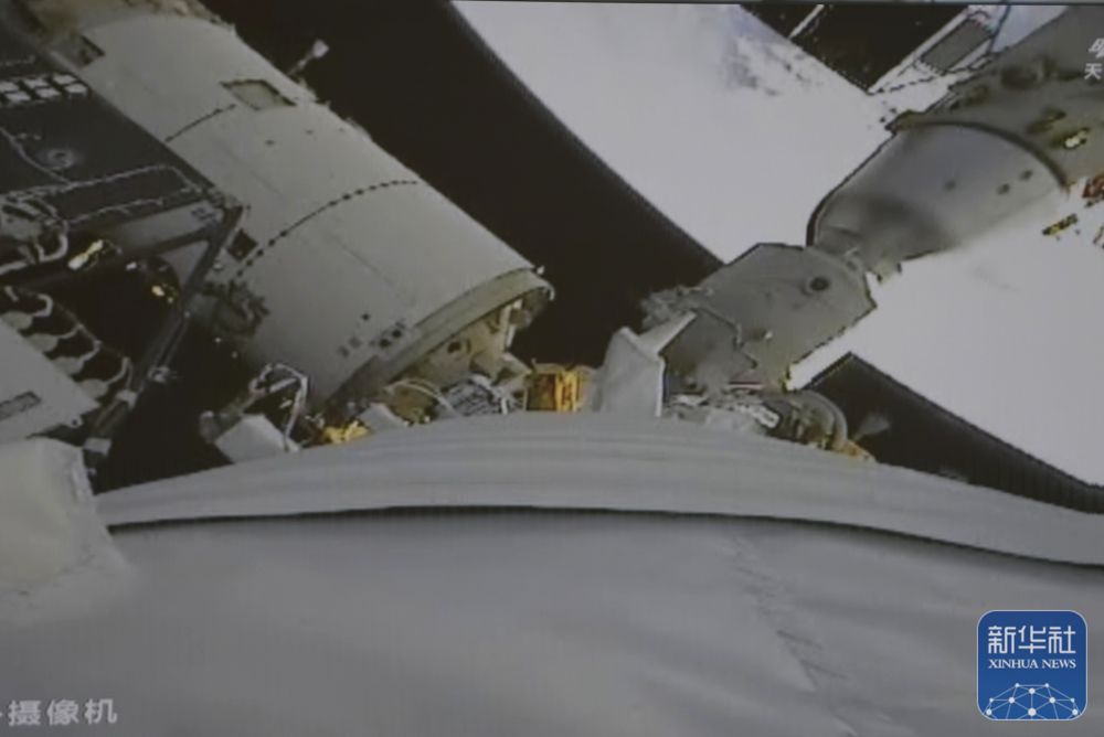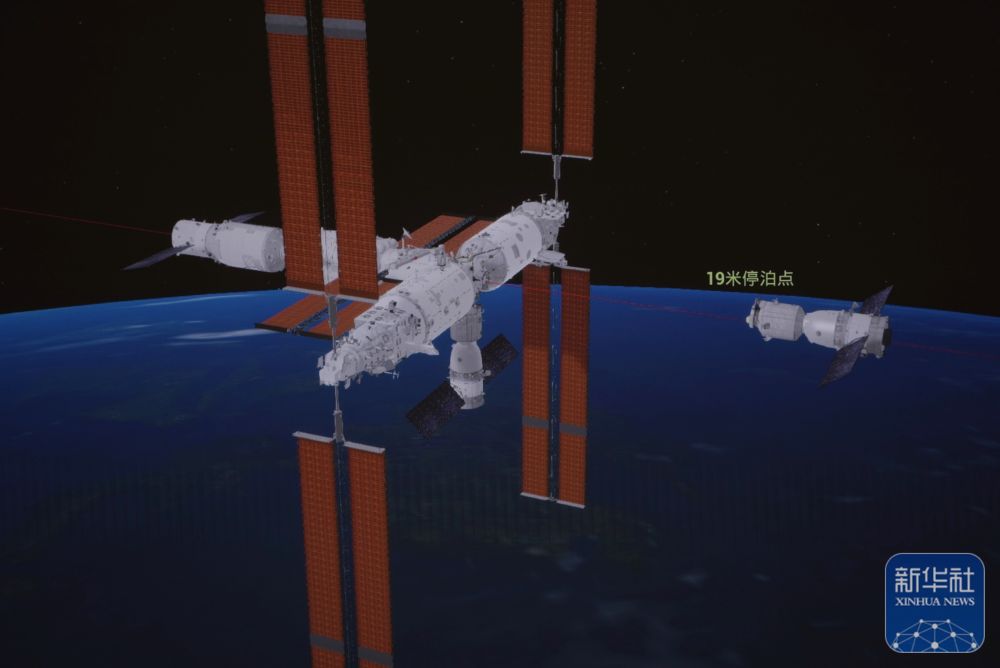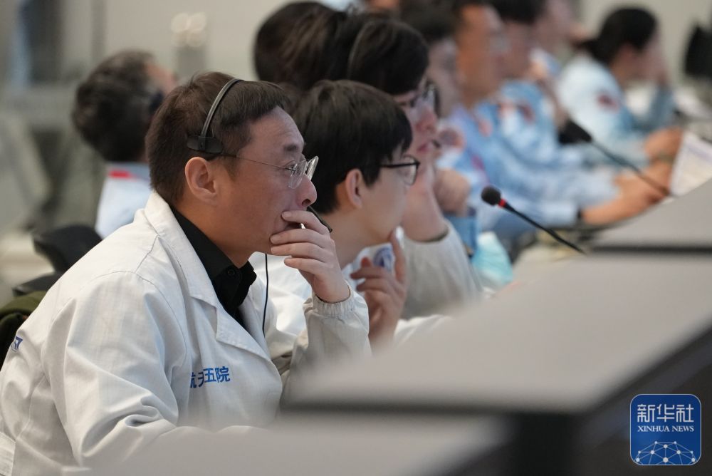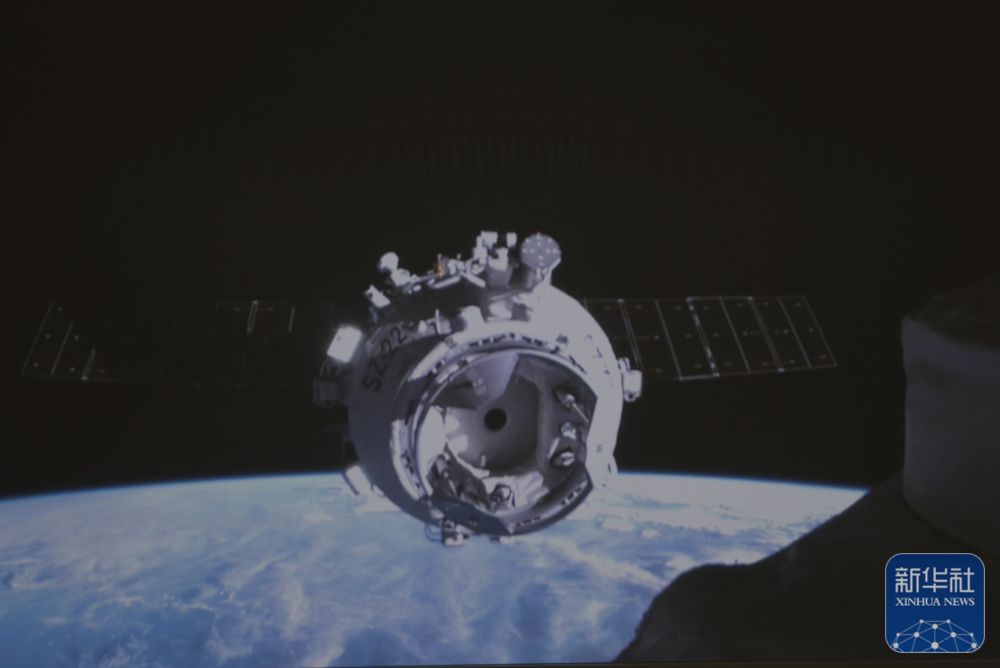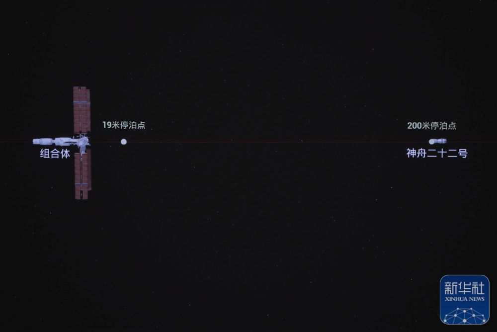 ↑ 这是11月25日在北京航天飞行控制中心拍摄的神舟二十二号飞船与空间站组合体交会对接过程的实时画面。