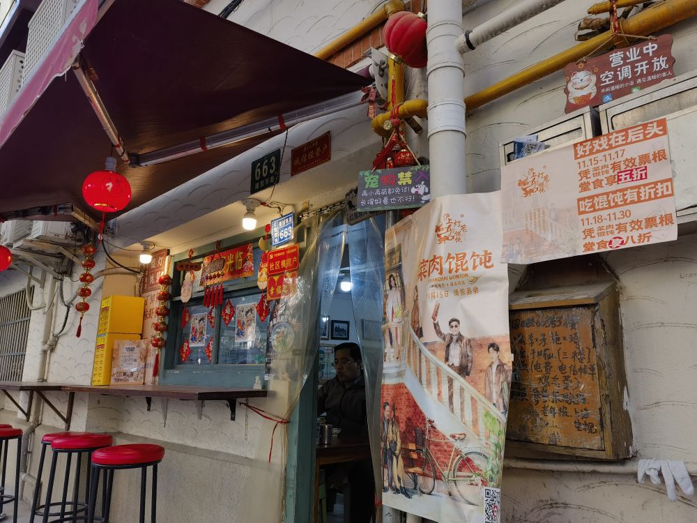 上海市徐汇区一家馄饨店门口张贴的电影海报和凭票根打折信息(2025年11月26日摄)。新华社记者陈爱平 摄