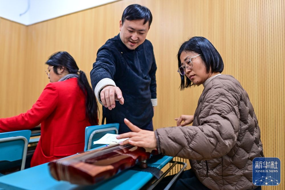 ↑ 11月26日,在宁波市江北青少年活动中心的青年夜校内,老师(中)在青年夜校的古琴课上指导学员。