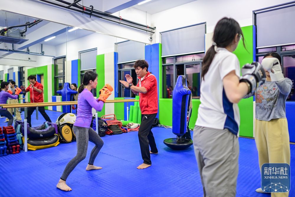 ↑ 11月26日,在宁波市江北青少年活动中心,教练员(左二)在青年夜校的自由搏击课上指导学员。
