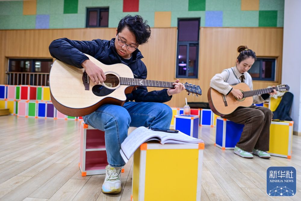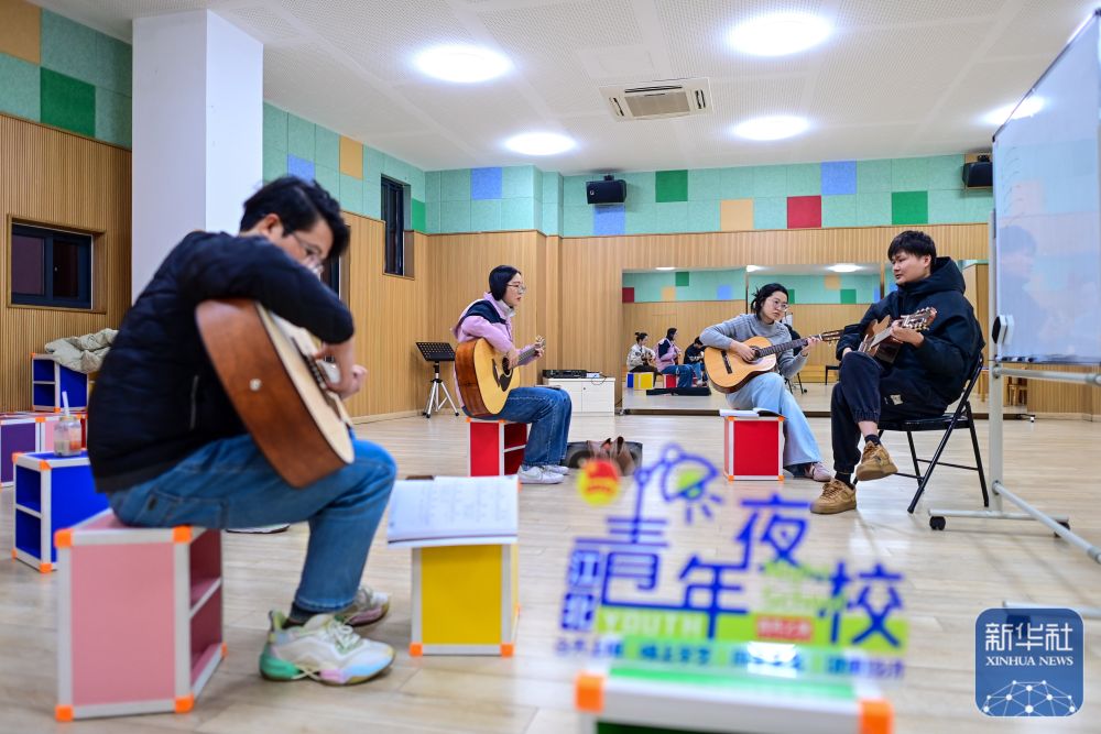 ↑ 11月26日,在宁波市江北青少年活动中心,参加青年夜校吉他课的学员在练习。