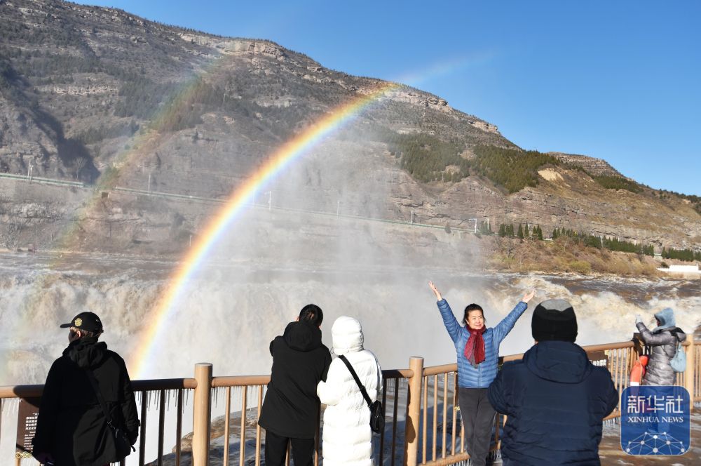↑ 12月3日,游客在山西吉县黄河壶口瀑布景区欣赏“双彩虹”景观。