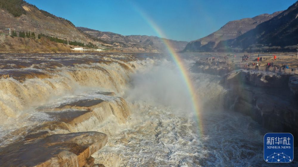 受上游水库调节放水影响,位于山西吉县和陕西宜川县交界处的黄河壶口瀑布水量增大,飞溅的水雾在阳光照射下形成“双彩虹”,吸引了众多游客。