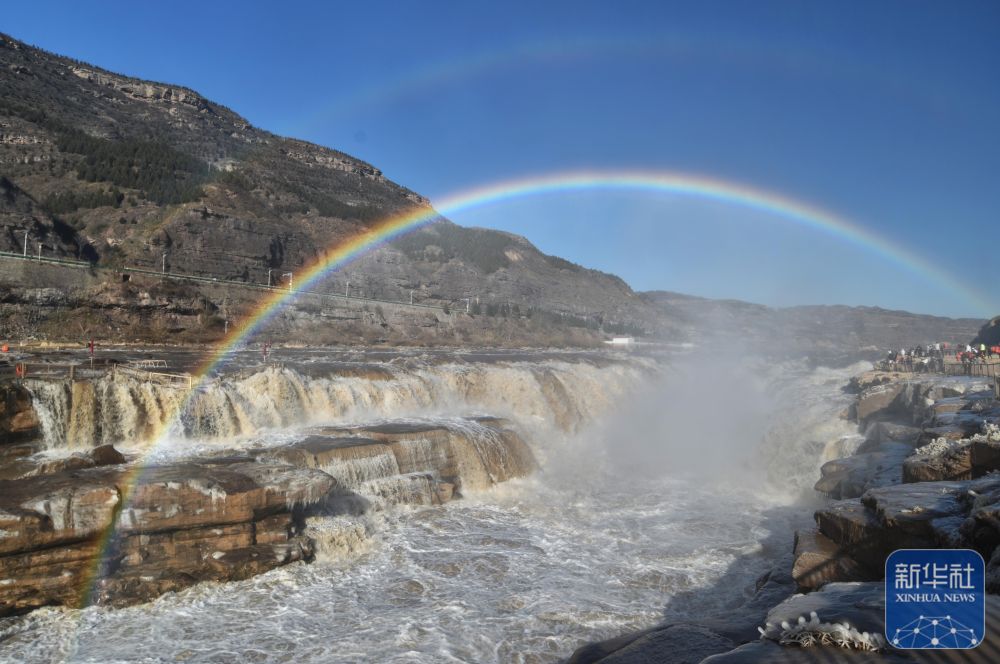 ↑ 12月3日,在山西吉县黄河壶口瀑布景区拍摄的“双彩虹”景观。