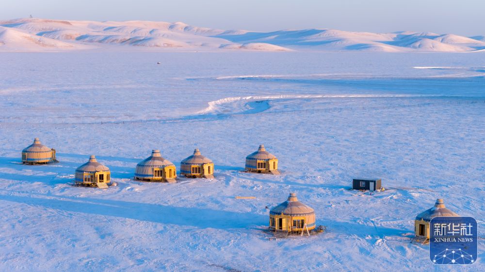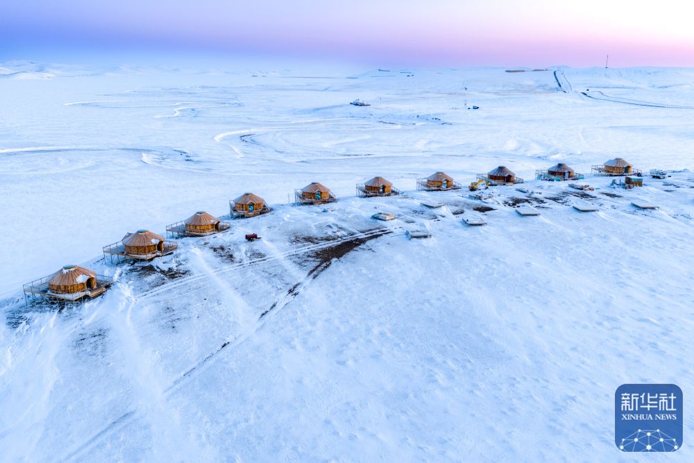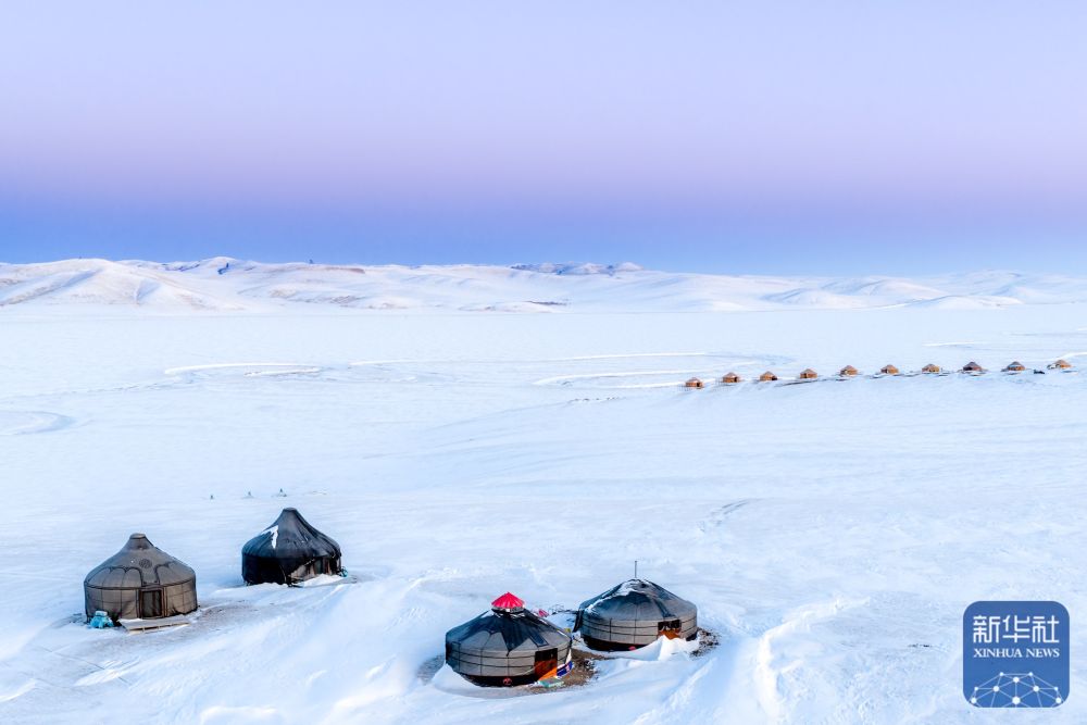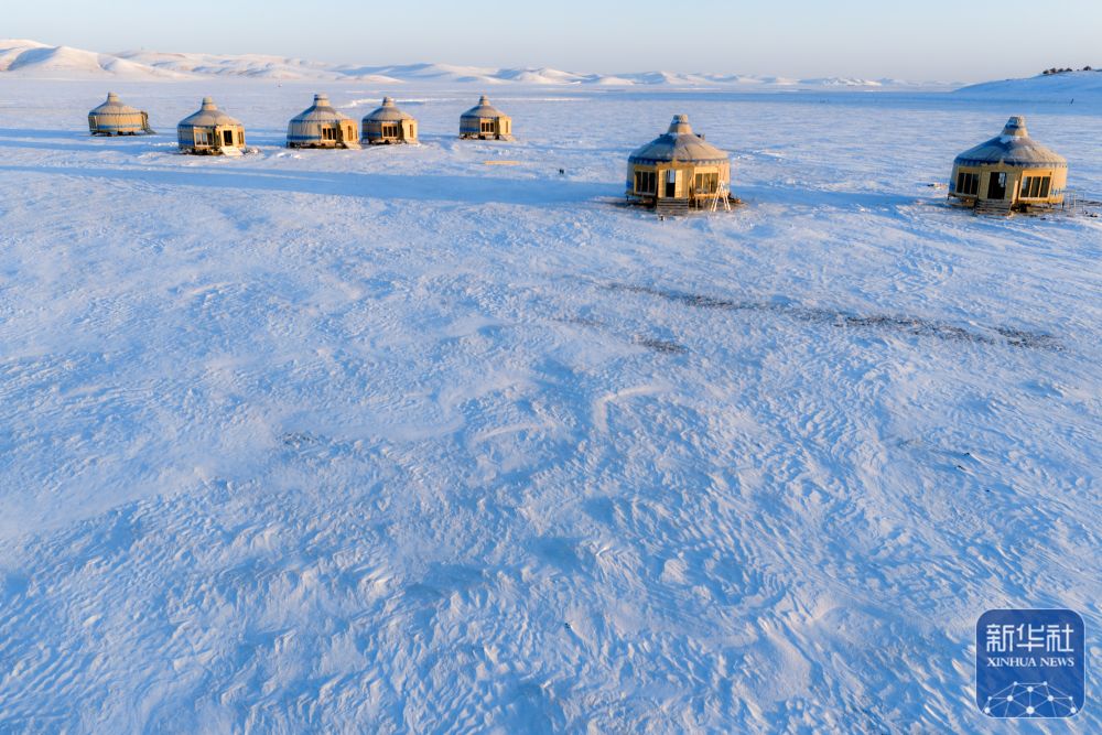 ↑ 这是12月3日在内蒙古呼伦贝尔市陈巴尔虎旗拍摄的雪原上的蒙古包(无人机照片)。新华社记者 达日罕 摄