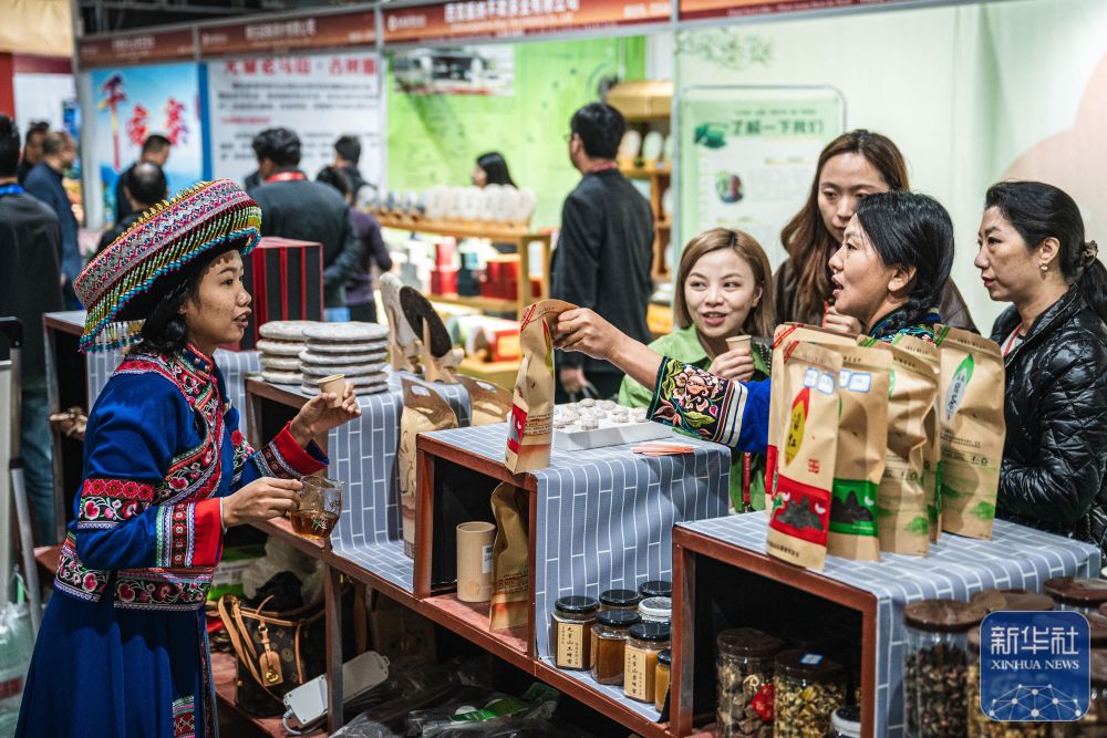 ↑ 12月5日,人们在活动现场咨询普洱茶产品。