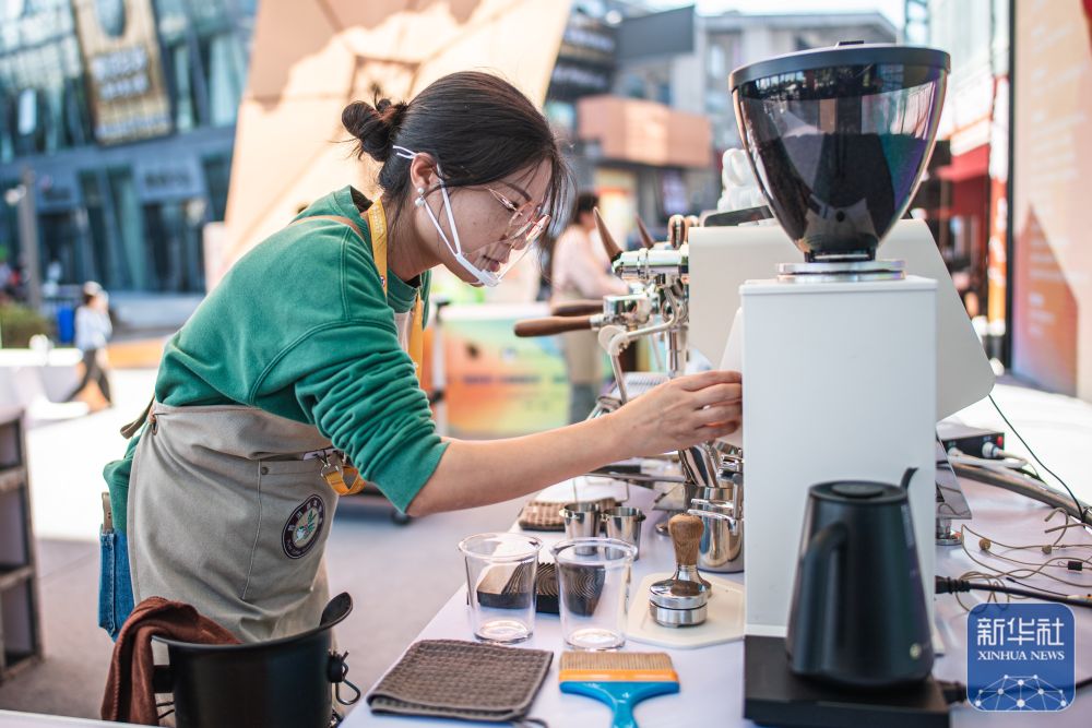 ↑ 12月5日,咖啡师在活动现场制作咖啡。