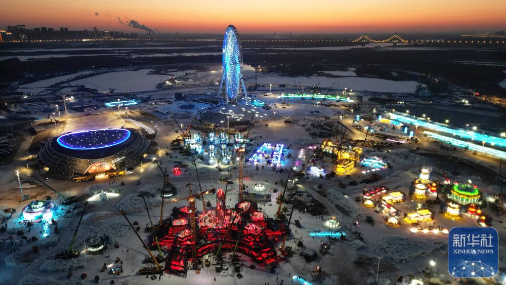 ↑ 12月3日拍摄的哈尔滨冰雪大世界冰建施工现场。新华社发(张树摄)
