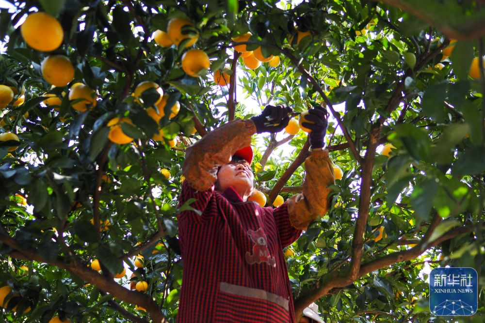 ↑ 12月11日,在浙江省庆元县竹口镇黄坛水干果园区内,工人在采摘甜桔柚。