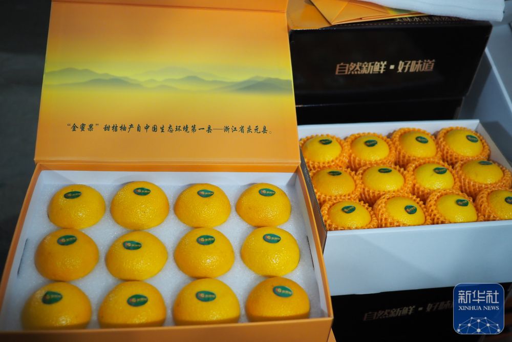 ↑ 这是12月11日在浙江省庆元县竹口镇黄坛水干果园区内拍摄的分装好的甜桔柚礼盒。