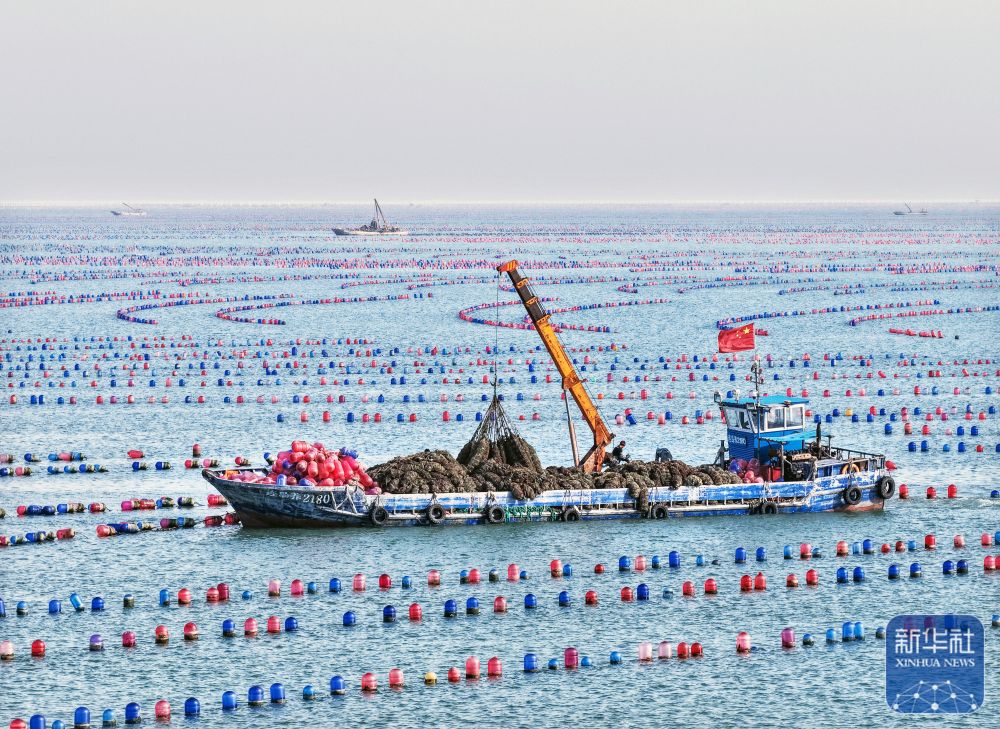 ↑ 12月15日,渔民在江苏省连云港市海州湾渔场养殖区收获牡蛎(无人机照片)。新华社发(王健民摄)