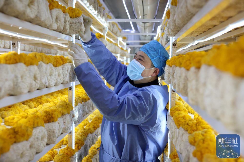 ↑ 12月16日,山东省枣庄市市中区农民在“智慧菇房”管护食用菌菇。新华社发(孙中喆摄)