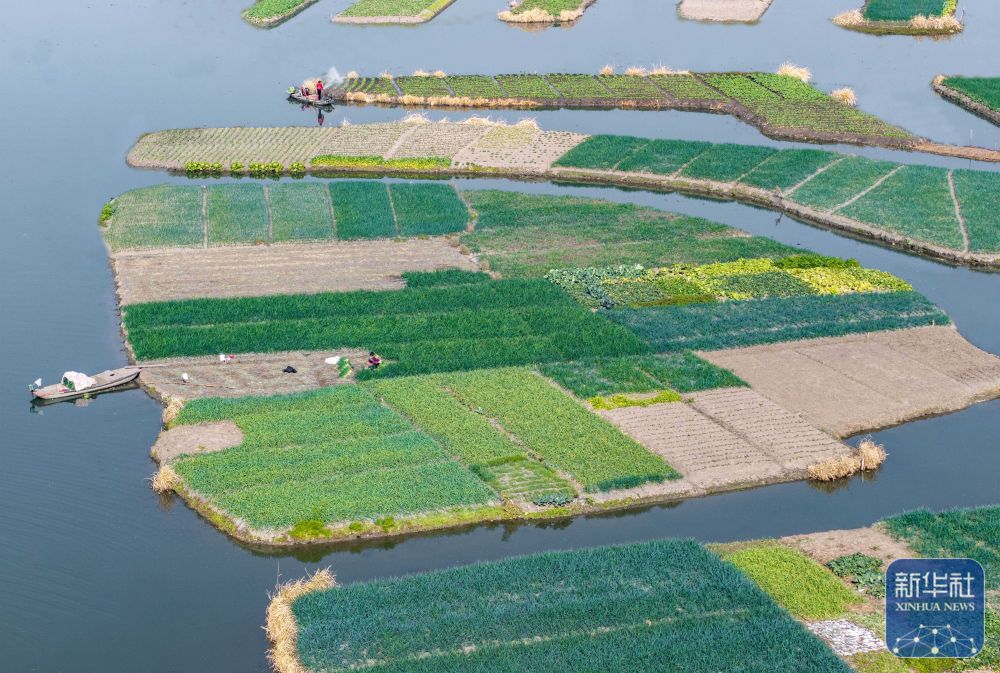 ↑ 12月16日,农民在江苏省兴化市垛田街道收获香葱(无人机照片)。新华社发(周社根摄)