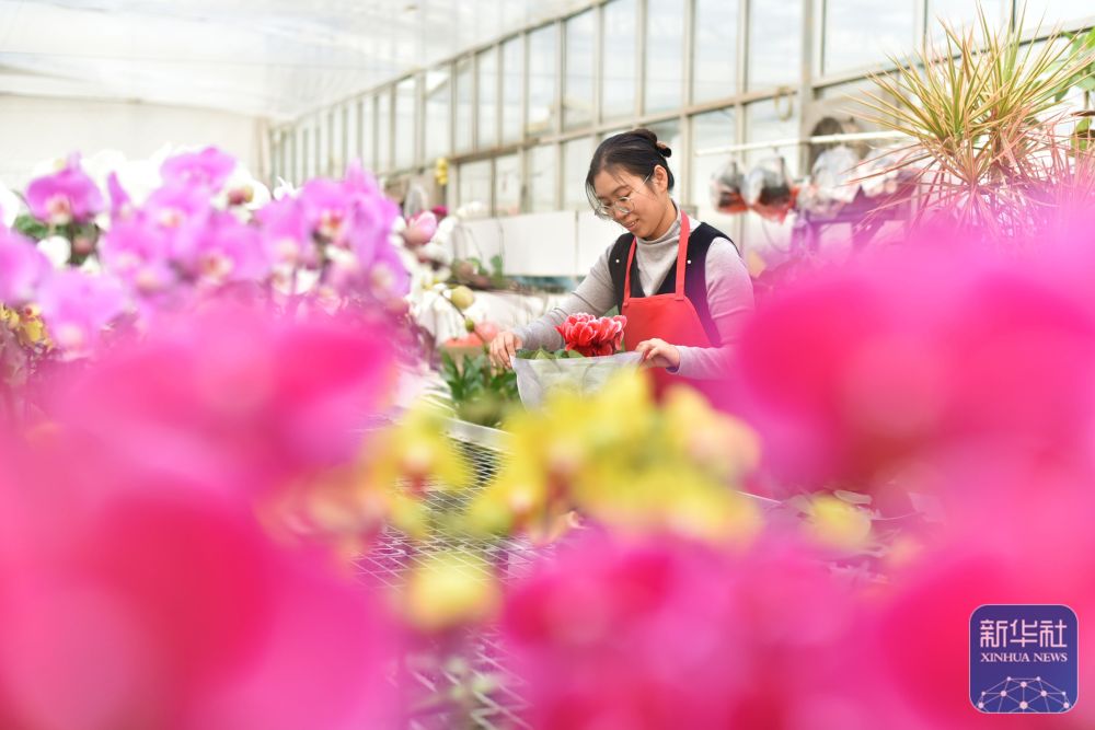 ↑ 12月16日,在山东省滨州市惠民县何坊街道,花农整理将要出售的花卉。新华社发(王军摄)