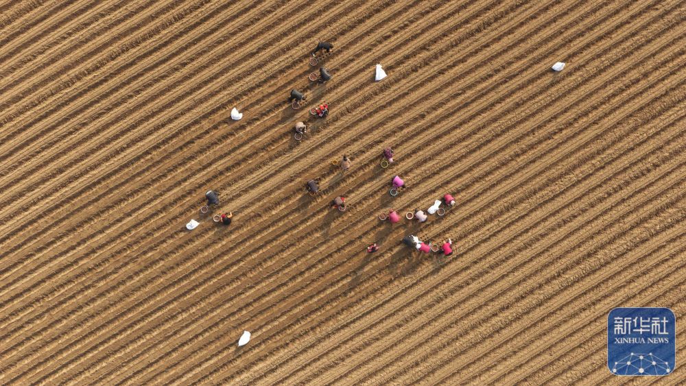 ↑ 12月16日,在山东省聊城市茌平区贾寨镇,农民在田间种植中药材玄参(无人机照片)。新华社发(赵玉国摄)